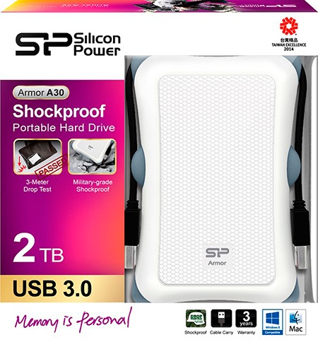 El disco duro Armor A30 de 2TB cuenta con un diseño innovador, resistente a golpes. Irrompible Su carcasa protectora está compuesta por gel sílice resistente a golpes y cuenta con una protección extra gracias a los saltones geles de sílice que están simétricamente construidas sobre la carcasa exterior. Éstos se transforman en ranuras exteriores para almacenar el cable USB.