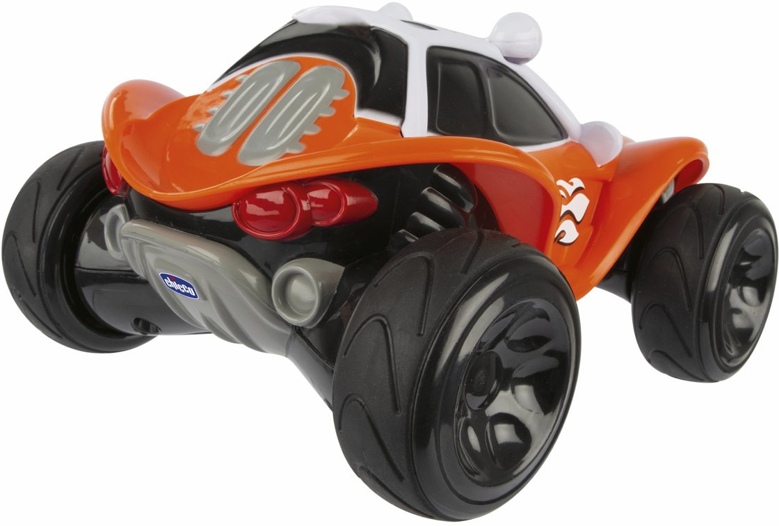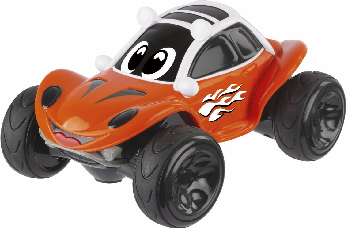 COCHE TELEDIRIGIDO\nDivertido coche radiocontrol con diseño buggy, diseñado especialmente para niños a partir de los 2 años. ¡Será todo un regalo! \n\nMANDO INTUITIVO\nSencillo mando con forma de rueda que cuenta con tan solo 4 botones para que sea fácil de agarrar y manejar por los niños y niñas más pequeños.\n\nRUEDAS TODOTERRENO\nLas grandes ruedas de este coche radiocontrol permiten que el juguete salte por encima de cualquier obstáculo y pueda correr por cualquier superficie plana.