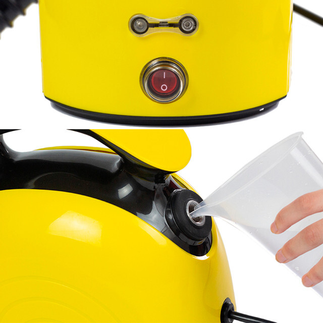 Vaporeta portatil vm-101 - múltiples modos de uso: colgado al hombro, asido con una mano o apoyado en el suelo u otra superficie plana. Cuenta con un habitáculo en la base paraguardar todos los accesorios tiempo de calentamiento: 6 minutos. Mínimo 45 minutos de uso antes de necesitar rellenar el depósito. Posibilidad graduar la cantidad de vapor expulsada. 3 puntos de seguridad: controlador doble de temperatura, válvula de seguridad y fusible. Pilotos indicadores: vapor listo falta agua. Potencía : 1500w -presion: 4bar -1, 1l de capacidad.