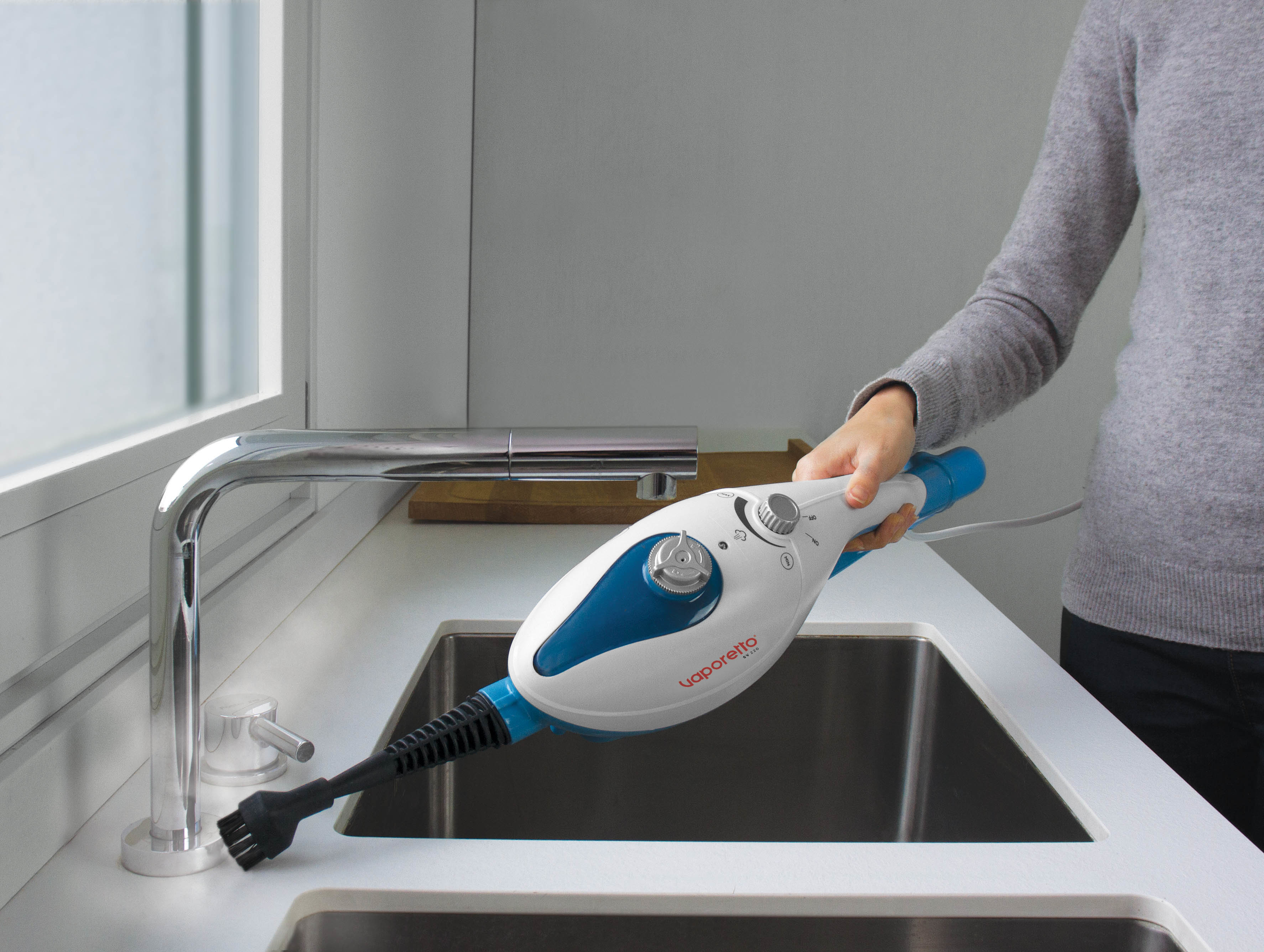Polti Vaporetto SV220. Tipo: Escoba limpiadora a vapor, Capacidad: 0,32 L, Color del producto: Turquesa, Blanco. Potencia: 1300 W, Voltaje de entrada AC: 220 - 240 V, Frecuencia de entrada AC: 50/60 Hz. Radio de operación: 5,5 m, Tiempo de preparación: 0,5 min. Peso: 1,6 kg, Ancho: 250 mm, Profundidad: 150 mm. Número de accesorios incluidos: 10 pieza(s)