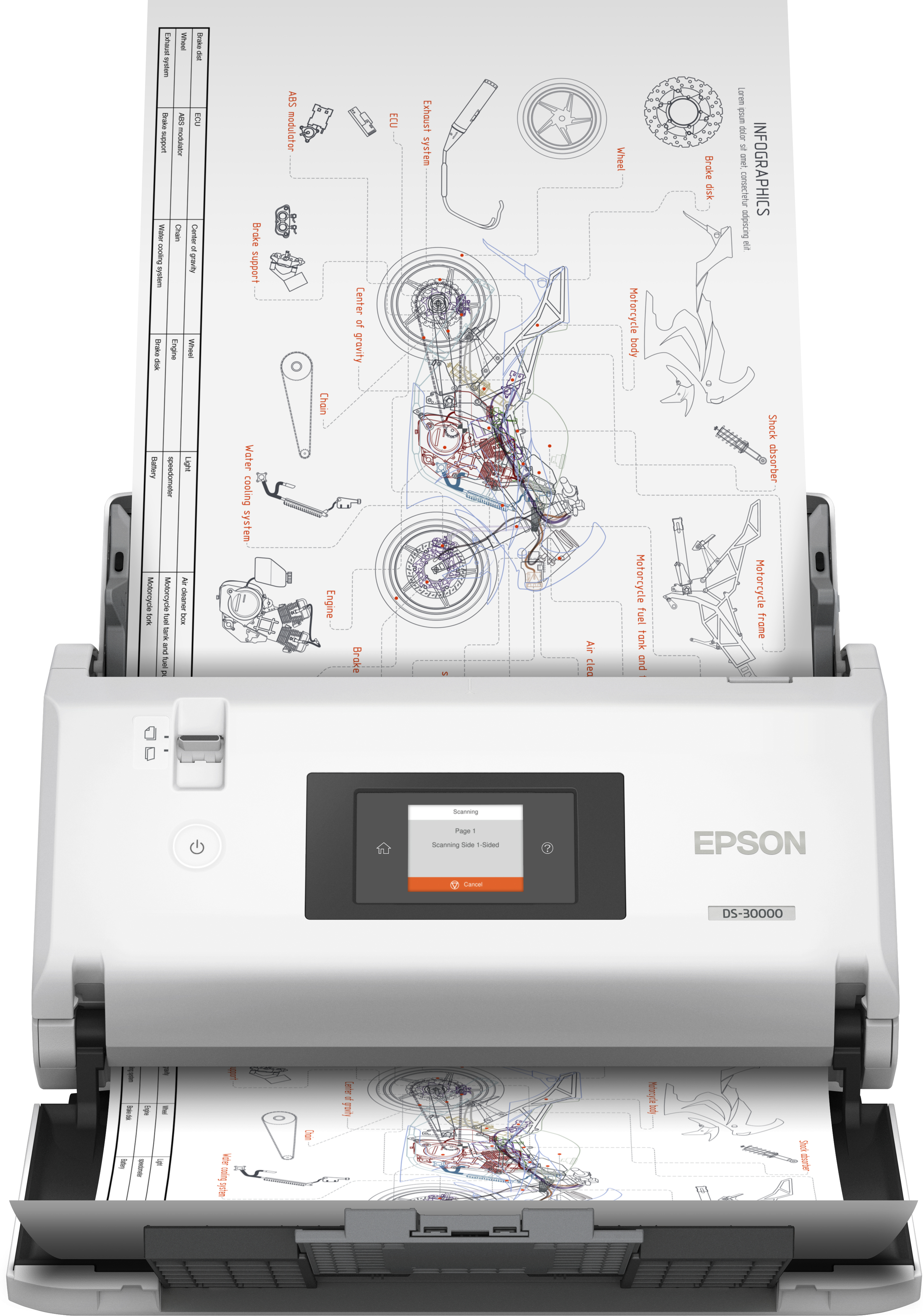 Gracias a la nueva Arquitectura de producción compleja de Epson, el diseño del DS-30000 cumple los más elevados estándares para asumir grandes cargas de trabajo. \n\nGracias a su gran capacidad y un resistente diseño, el alimentador automático de documentos (ADF) permite escanear la gama más amplia de soportes de su clase¹. Escanea pasaportes2, cartillas, carnés y documentos de gran formato. \n\n El escaneado resulta más fácil gracias a una pantalla táctil retroiluminada de 2,7 pulgadas que, con sencillas instrucciones paso a paso, puede mostrar trabajos de escaneado predefinidos así como emitir avisos para la limpieza o mantenimiento del equipo.\n\nAdemás, los avanzados sensores integrados de protección del papel impiden que los documentos resulten dañados, mientras que los sensores ultrasónicos permiten el escaneado de todo tipo de documentos para garantizar la integridad de los datos.\n\nEl DS-30000 incluye el software Document Capture Pro 3.0, con funcionalidad OCR integrada para obtener imágenes claras y nítidas. Una amplia variedad de controladores, incluidos TWAIN, ISIS, WIA, SANE y ICA, permiten integrar fácilmente la unidad en la mayoría de los sistemas de gestión de documentos.\n\nPara disfrutar de mayor flexibilidad y comodidad, los escáneres planos opcionales A4 (DS-5500) y A3 (DS-50000) permiten escanear libros, publicaciones encuadernadas y otros soportes.