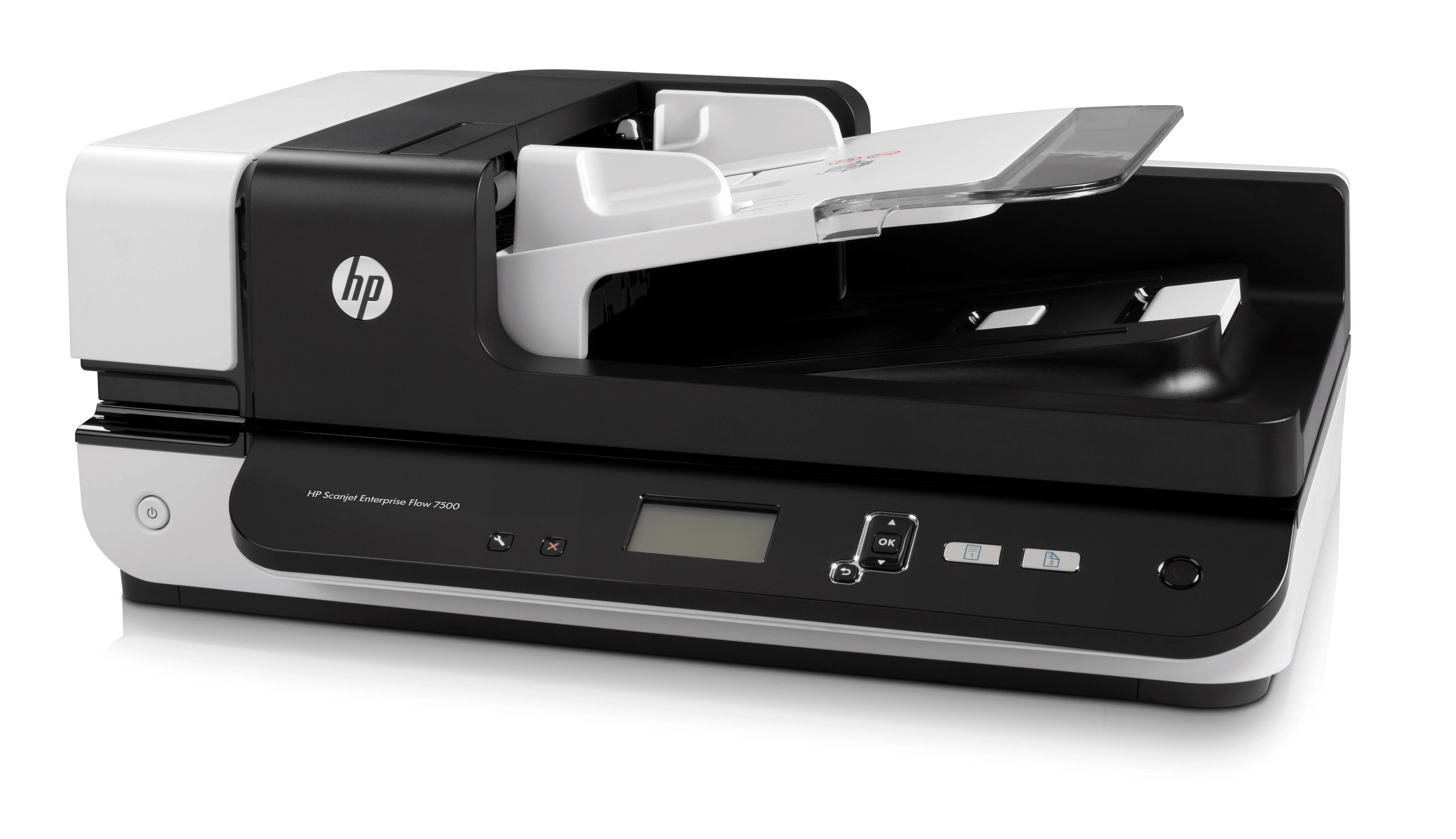 HP Escáner plano Scanjet Enterprise Flow 7500, Scanjet. Tamaño máximo de escaneado: 216 x 356 mm, Resolución óptica de escáner: 600 x 600 DPI, Velocidad de escaneo ADF (b/n, A4): 50 ppm. Tipo de escaneado: Flatbed & ADF scanner, Color del producto: Negro, Blanco, Pantalla: LCD. Tipo de sensor: CCD, Ciclo de trabajo diario (max): 3000 páginas, Fuentes de luz: LED. Capacidad del alimentador automático de documentos: 100 hojas. Tamaño máximo de papel ISO A-series: A4, Tipos de media soportados de escaneo: Papel fotográfico, Papel normal, Tamaño máximo de escaneado (ADF): 216 x 864 mm