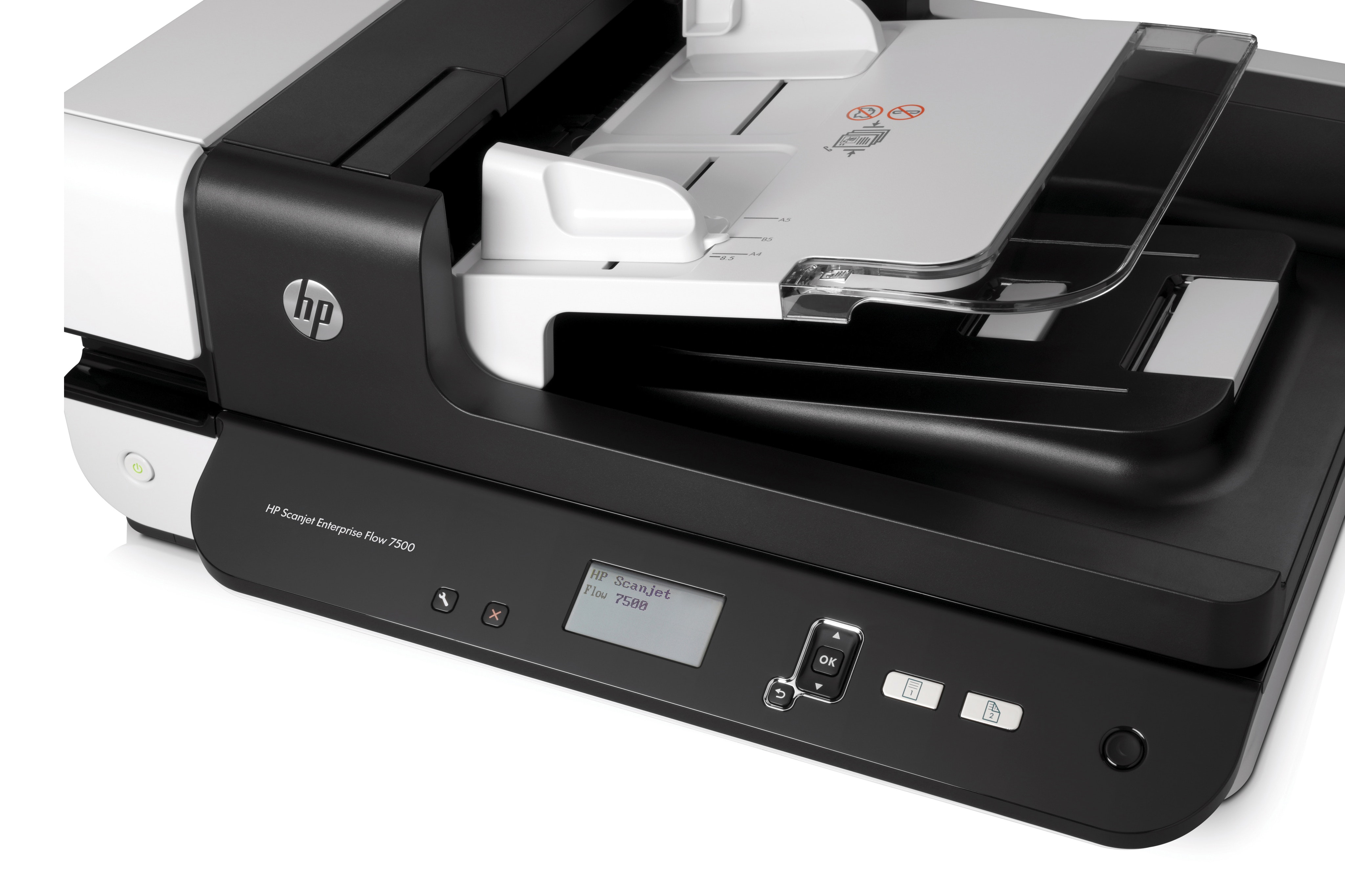 HP Escáner plano Scanjet Enterprise Flow 7500, Scanjet. Tamaño máximo de escaneado: 216 x 356 mm, Resolución óptica de escáner: 600 x 600 DPI, Velocidad de escaneo ADF (b/n, A4): 50 ppm. Tipo de escaneado: Flatbed & ADF scanner, Color del producto: Negro, Blanco, Pantalla: LCD. Tipo de sensor: CCD, Ciclo de trabajo diario (max): 3000 páginas, Fuentes de luz: LED. Capacidad del alimentador automático de documentos: 100 hojas. Tamaño máximo de papel ISO A-series: A4, Tipos de media soportados de escaneo: Papel fotográfico, Papel normal, Tamaño máximo de escaneado (ADF): 216 x 864 mm