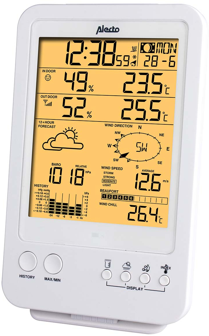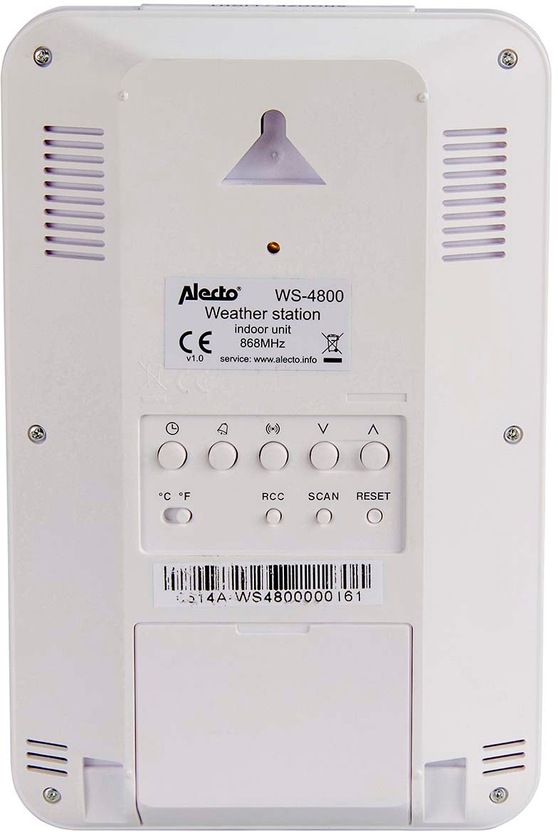 Alecto WS-4800. Color del producto: Blanco, Funciones de medición: Higrómetro de interior, Termómetro de interior, Barómetro para exteriores, Higrómetro de..., Datos extremos de estación climatológica: Higrómetro, Termómetro. Tipo de visualizador: LCD, Diagonal de la pantalla: 14 cm (5.5""). Fuente de energía: Batería, Tipo de batería: AA. Ancho: 343 mm, Profundidad: 136 mm, Altura: 393 mm
