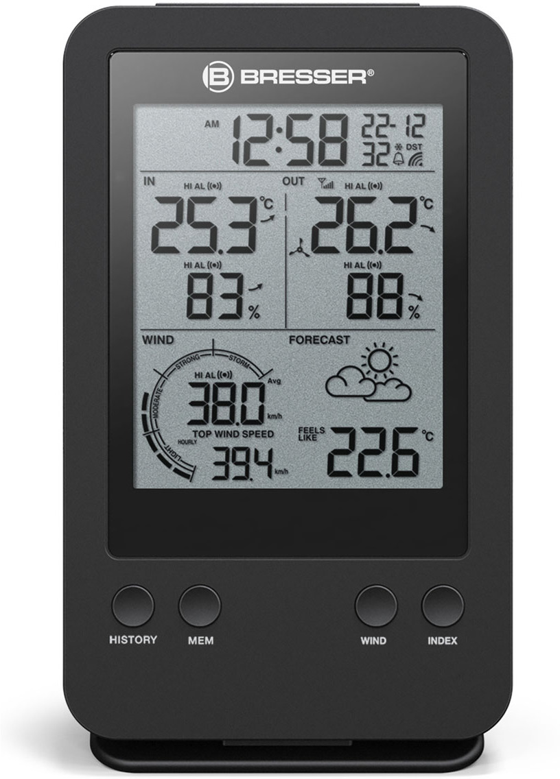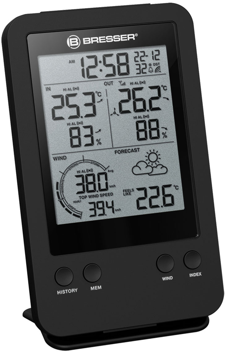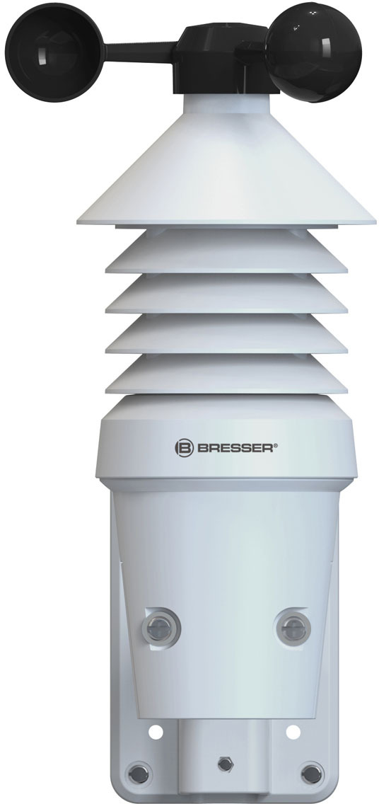 El anemometro de BRESSER es un dispositivo profesional para usar en jardines domesticos. A traves de la base no solo puede leer la velocidad del viento actual, sino que ademas puede visualizar valores medios y valores maximos de cada hora, dia, mes o a?o. Tambien se puede ajustar una alarma de la velocidad del viento.El sensor exterior 3en1, ademas de la velocidad del viento, calcula tambien la temperatura exterior y la humedad del aire. Los valores registrados se transmiten de forma inalambrica hasta una distancia de alcance maxima de 150 m a la base.La base tambien tiene sensores integrados para medir la temperatura ambiente y la humedad del aire.