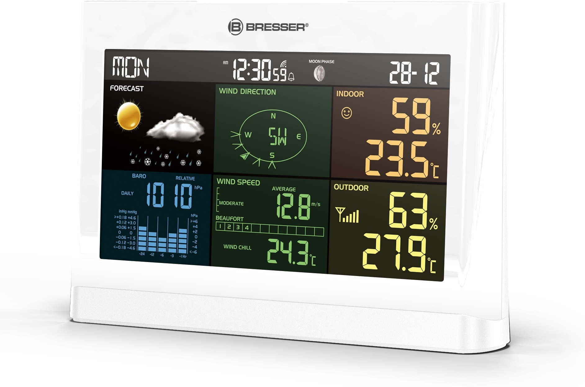 El nuevo Centro meteorologico BRESSER 5 en 1 Confort con pantalla a color combina de una manera unica un dise?o compacto con una amplia informacion meteorologica. Su sensor exterior multifuncion, concebido con un dise?o compacto, puede situarse en casi cualquier lugar sin precisar mucho espacio. Incluye abrazaderas de tubo y roscas (diametro de las roscas 25-33 mm aprox.) para que pueda montarla en mastiles asi como un pie abatible para su montaje en superficies llanas.El sensor exterior 5 en 1 transmite de forma fiable a la estacion base los valores obtenidos para la velocidad del viento, direccion del viento, humedad, temperatura y precipitaciones. En la pantalla de la estacion base, concebida de manera clara y estructurada, podra observar no solo estos valores sino tambien multiples datos de su historial. La memoria interna le guarda los datos recopilados durante 24 horas. De todos los datos registrados, la estacion meteorologica calcula una prevision meteorologica local altamente fiable para las siguientes 12h, que se muestran en la pantalla con seis simbolos graficos. Para los valores maximos y minimos, podra programar una alarma de manera individual que producira una se?al acustica y luminica. Para las temperaturas exteriores inferiores a los -3 ?C podra activar una alarma especial para heladas y nieve. Un clima ambiental malo perjudica la salud de los ni?os y la gente mayor. Para ello, esta estacion le ofrece una funcion inteligente. El indicador de clima ambiental le informa mediante simbolos sobre el estado de su clima ambiental. Ademas, dispone de una funcion de actualizacion de la fecha y la hora mediante se?al de radio DCF. Pocos minutos despues de encender su estacion, recibira de manera automatica la hora actual centroeuropea (CET) y la fecha con el dia de la semana. La estacion tambien dispone de una funcion de alarma con repeticion (Snooze). Para todo aquellos fascinados por la luna, la estacion visualiza las distintas fases lunares.