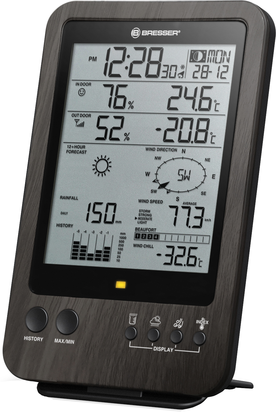 La nueva estación meteorológica 5 en 1 de BRESSER combina de una forma única un estilo compacto con un servicio de información completo. El sensor exterior multifunción con diseño compacto, necesita poco espacio y puede colocarse casi en cualquier sitio. Se incluyen una abrazadera para tubos y tornillos para su colocación en postes (medida de tubo de aproximadamente 25 - 33mm) así como un pie para su montaje. Además, el centro meteorológico cuenta con un ajuste horario y de datos radio controlado (señal DCF). Pocos minutos después del encendido, se muestran automáticamente la Hora Central Europea (CET) y la fecha. También se muestran las diferentes fases de la luna. Incluye una función de alarma y una función de repetición (Snooze). Características: Tipo de pantalla: Digital Estación: Primavera, Otoño, Invierno, Verano Indicación de la hora y fecha: 24/12 horas Temperatura interior (ºC) de: -40 a 70 Temperatura exterior (ºC) de: -40 a 80 Mediación de la presión atmosférica (mbar): 850 a 1050 Rango de medición de humedad (%): 20 a 90 Aviso de tormenta y alerta meteorológica Medición del viento: Velocidad y dirección del viento Rango de medición de lluvia: 0 a 9999 mm Rango de medición de la velocidad del viento (km/h): 0 a 180 Tendencia del tiempo Frecuencia de emisión: 868 MHz Distancia de emisión: 30m Iluminación: Retroiluminación Altavoz: 1 (mono, integrado)