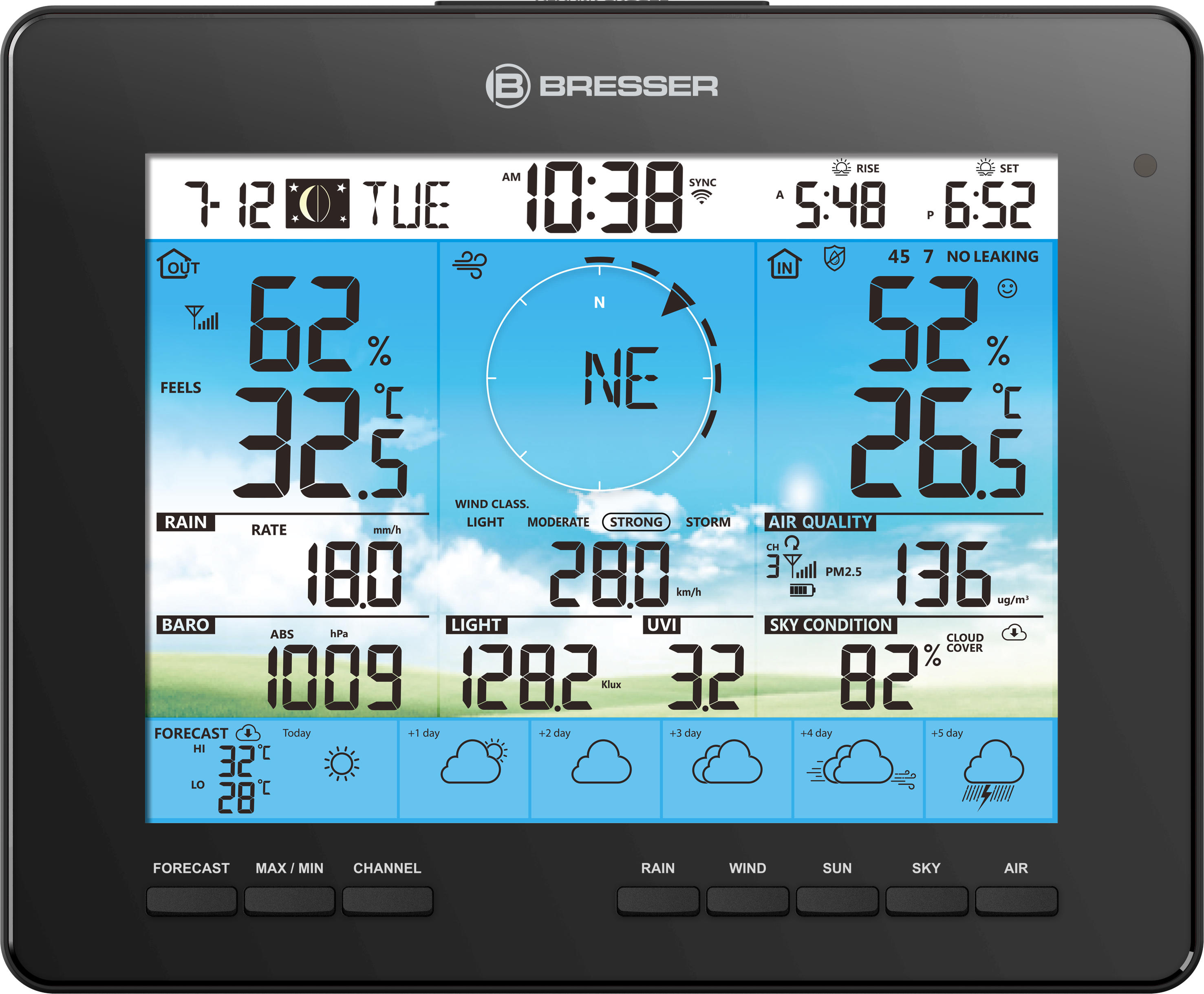 Manténgase al tanto del tiempo con el centro meteorológico BRESSER 7 en 1 solar de 6 días 4CAST PRO Wi-Fi. El centro meteorológico cuenta con una elegante pantalla a color y muestra una previsión meteorológica fiable de 6 días. Los datos de la previsión meteorológica se transfieren desde la plataforma ProWeatherLive a la estación meteorológica Wi-Fi solar y se muestran como un símbolo gráfico. La pantalla también muestra la visibilidad local y la cobertura de nubes desde el servidor ProWeatherLive..Estación meteorológica ecológica alimentada por energía solar.La estación meteorológica viene con un sensor exterior alimentado por energía solar, que proporciona datos fiables para 7 mediciones meteorológicas locales: temperatura, humedad, velocidad del viento, dirección del viento, precipitaciones, nivel de rayos UV e intensidad de la luz. Las mediciones se envían a la estación base con un alcance de hasta 150 metros. El gran panel solar se coloca fácilmente en la posición perfecta. La batería incorporada almacena la energía solar para alimentar el sensor exterior en su jardín o en el tejado de su casa o garaje..Estación base repleta de funciones.Además de una pantalla intuitiva que muestra las mediciones del sensor inalámbrico alimentado por energía solar, la estación base cuenta con otras muchas funciones. Por ejemplo, mide la temperatura interior, la humedad y la presión atmosférica y cuenta con un indicador de confort que muestra un smiley para indicarle si el clima interior es ideal. Así podrá tomar medidas para evitar el moho y el aire seco. Además, la estación meteorológica alimentada por energía solar también calcula otras lecturas útiles, como la temperatura percibida, el tiempo de insolación en minutos y el índice de Beaufort, para ayudarle a elegir la ropa adecuada, evitar las quemaduras solares y garantizar una protección adecuada contra el viento. Y para estar al tanto del tiempo, la memoria de máximas/mínimas le permite estar al tanto de las últimas novedades meteorológicas, ya sea a diario o a partir de un momento determinado..Comparta los datos de su centro meteorológico y utilícelos de forma inteligente.Acceda a sus propias mediciones desde cualquier lugar y compártalas con otros: con la estación meteorológica solar con pluviómetro y anemómetro y una plataforma meteorológica como ProWeatherLive, Weather Underground o WeatherCloud, está a sólo unos clics de distancia. También puede conectar el centro meteorológico al portal alemán AWEKAS. Si tiene una casa inteligente, puede transferir gratuitamente los datos de medición de la estación meteorológica solar a su sistema de casa inteligente. Para cargar sus lecturas, simplemente configure los ajustes como se describe en el siguiente enlace:.https://www.awekas.at/for2/index.php?thread/17080-software-api-stations-api-beschreibung-beta/.Estación meteorológica solar con reloj y alarma integrados.Hora, fecha, día de la semana y fase lunar: el centro meteorológico solar 4CAST PRO Wi-Fi tiene t