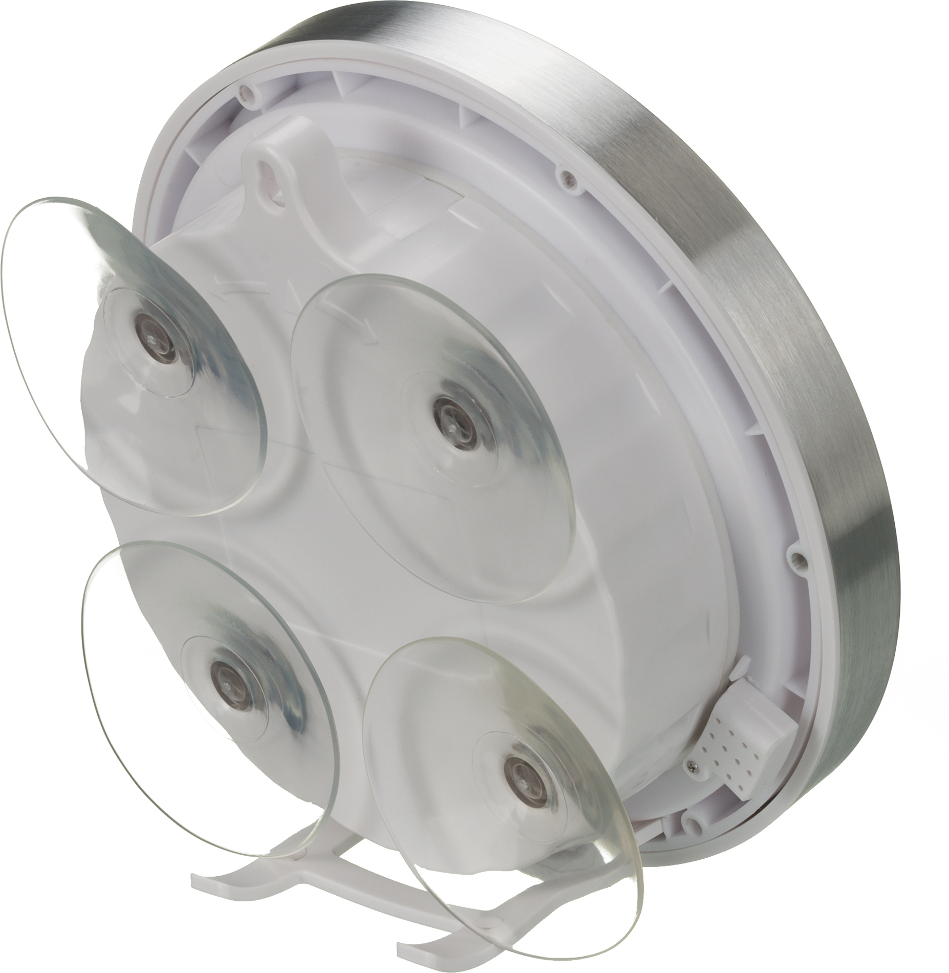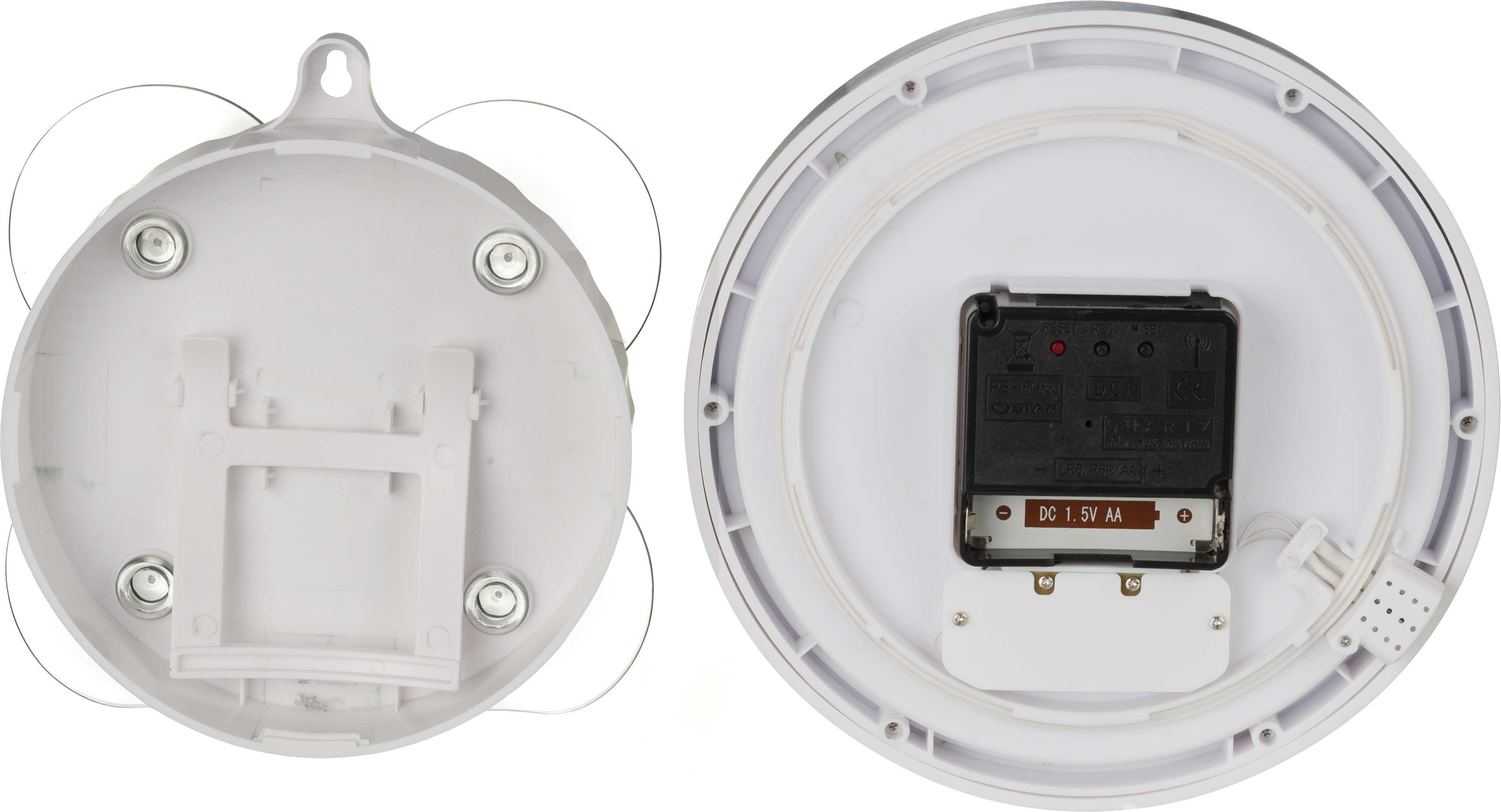 Se puede colgar en la pared con un clavo, para lo cual tiene una argolla en la parte trasera. Para no dañar los azulejos del cuarto de baño, puiede colgarlo en la pared con las ventosas incluidas o de pie con la base incluida. Funciona con 1 pila AA (no incluida), por lo que se puede colocar en cualquier lugar.