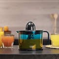 Exprimidor de cítricos eléctrico con 40 W de potencia. | Incluye: un filtro regulador de pulpa regulable para hacer zumos con más o menos pulpa. Dos conos extraíbles para cítricos pequeños o grandes. | Doble sentido de giro para aprovechar al máximo la fruta, aumentando así la cantidad de zumo extraído. Comienza a funcionar automáticamente simplemente presionando la fruta en el cono. | Tambor hecho con