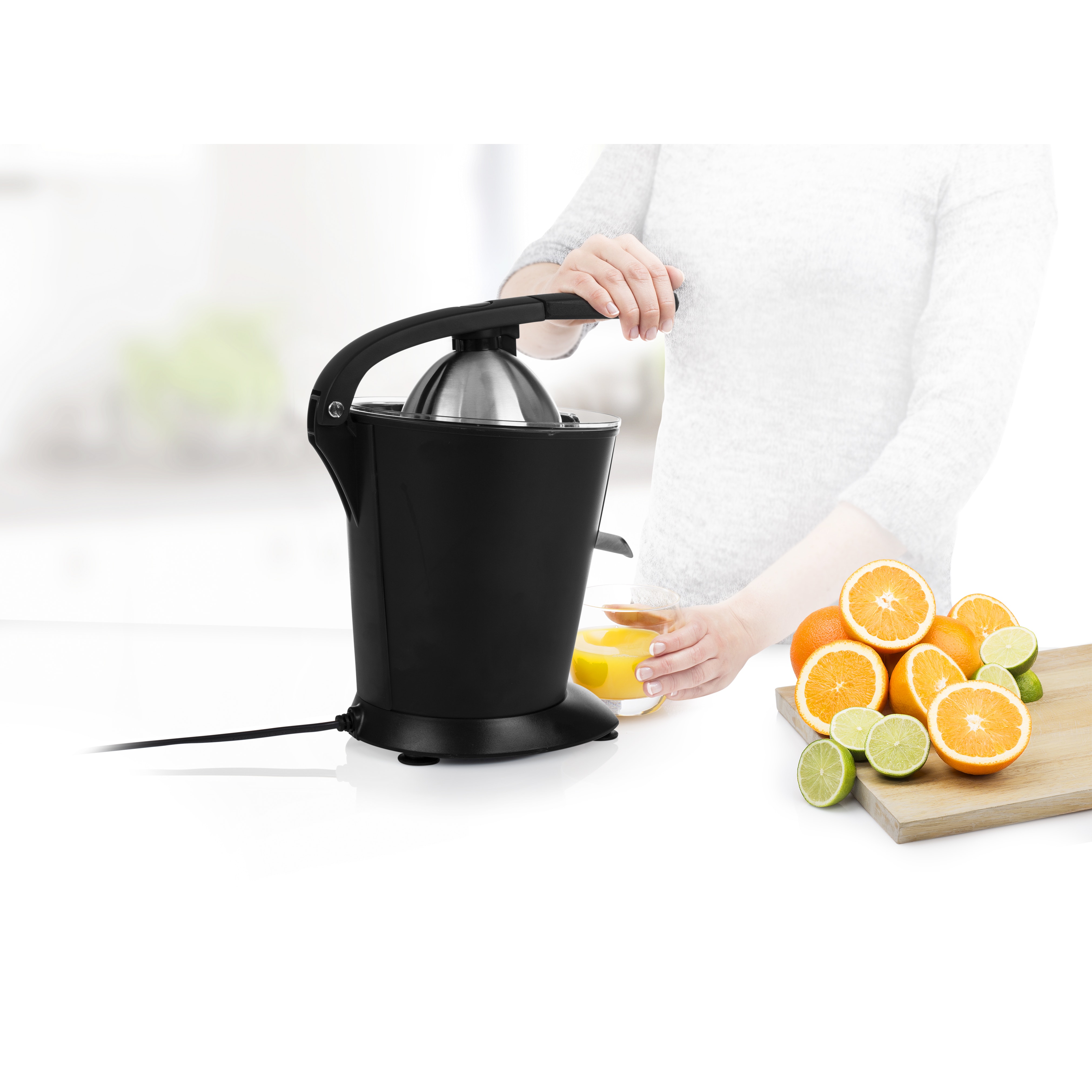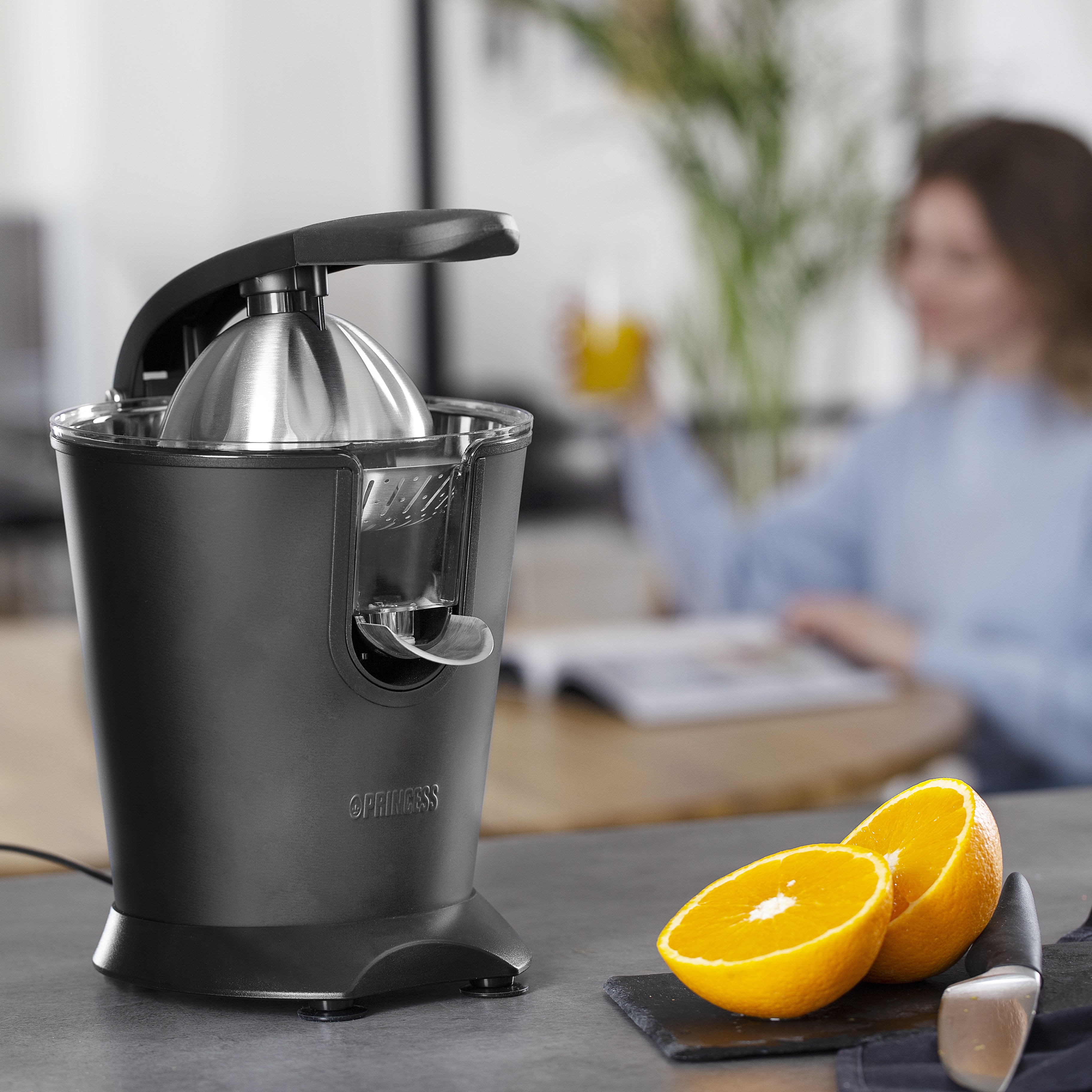 Para celebrar su 25 aniversario, Princess le ofrece una colección especial en acero negro. Con una carcasa en negro mate, Princess 201853 es el elegante exprimidor definitivo para cualquier persona que desee poder exprimir en casa cítricos como un profesional. Este exprimidor semiprofesional cuenta con un brazo de palanca de aluminio fundido que garantiza que se exprima hasta la última gota de zumo sin emplear mucha fuerza. Déjese mimar con el lujo de empezar el día con un vaso de zumo de naranja recién exprimido.\n\nPara todo tipo de cítricos\nEl cono especial del exprimidor Princess cuenta con relieves verticales que lo hacen adecuado para exprimir cítricos grandes y pequeños de manera muy rápida. Los relieves garantizan que el cítrico permanezca en su sitio durante el exprimido. Empiece el día acelerando el metabolismo al beber un vaso de agua con zumo de limón recién exprimido. Una buena manera de empezar un día ajetreado.\n\nBrazo de palanca de aluminio fundido\nGracias al fuerte brazo de palanca del exprimidor Princess, no es necesario emplear mucha fuerza para exprimir el zumo de las naranjas, por lo que es posible exprimir mucho zumo en poco tiempo. El zumo pasa por el filtro para pulpa directamente al vaso. Delicioso zumo recién exprimido rico en vitaminas para toda la familia y preparado en un momento.\n\nMuy potente y con motor silencioso\nEl potente motor de 160 W garantiza que se exprime todo el zumo de los cítricos. Aunque el motor tiene mucha potencia, es muy silencioso, por lo que puede empezar a exprimir zumo el domingo por la mañana sin despertar a su pareja o a los niños.\n\nFácil de limpiar\nTodas las piezas extraíbles del exprimidor Princess se pueden lavar en el lavavajillas por lo que su limpieza después de exprimir resulta muy sencilla. El exprimidor tiene un sistema antigoteo por lo que puede parar el flujo del zumo para cambiar de vaso y no se tendrá que preocupar de posibles residuos pegajosos en la encimera.\n\nColección acero negro\nPrincess lleva hasta su cocina la última tendencia en diseño de interiores con su nueva Colección acero negro. Esta colección está compuesta por elegantes electrodomésticos de cocina con un moderno revestimiento en negro mate que combina perfectamente con su cocina moderna. Si desea prepararse una tostada o un café, ahora podrá hacerlo con elegancia gracias a la Colección acero negro.\n\nContenido de la caja:\nExprimidor de cítricos Princess, cono universal, filtro para pulpa, depósito con sistema antigoteo, manual de instrucciones
