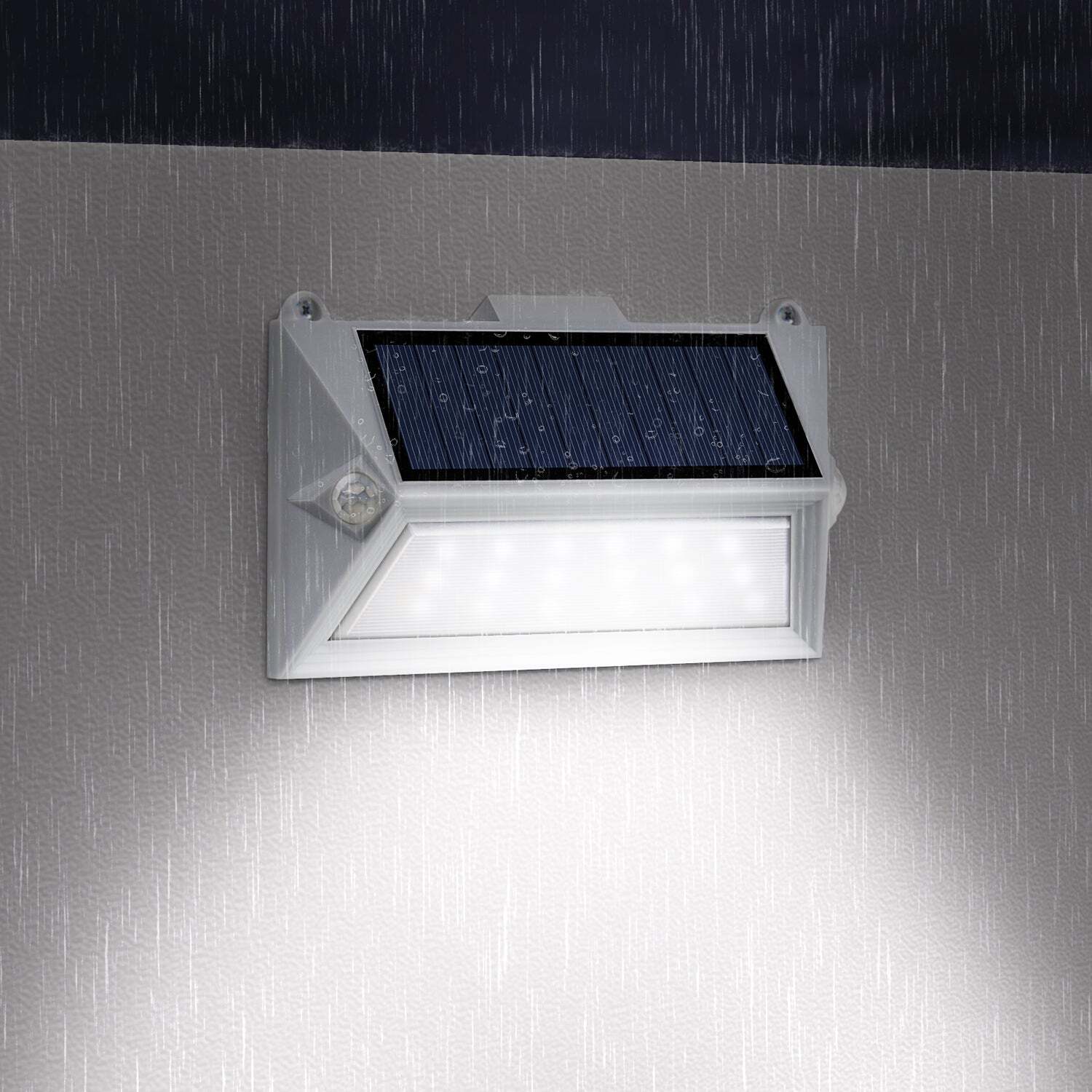ALTO RENDIMIENTO DE ILUMINACIÓN: el foco LED solar Poly funciona gracias a su gran panel solar que recoge la energía durante el día, la almacena en sus baterías de alta capacidad, para alimentar automáticamente los 18 LEDs blancos extra potentes de 150 Lúmenes al caer la noche que se iluminarán bajo la acción del detector crepuscular. Este foco de exterior le ofrecerá una iluminación de luz fría que dará un rendimiento intenso y muy brillante. AUTONOMÍA Y SOLIDEZ: el tiempo de recarga es de 6-8 horas. La autonomía es de 8 a 12 horas. El poli se puede utilizar en cualquier clima (100% impermeable), y es resistente a los rayos UV y a las temperaturas extremas. Este foco está fabricado con materiales duraderos (plástico y acero). Perfecto para iluminar una entrada, un jardín, una piscina, un patio, una terraza, un balcón, un aparcamiento, un patio, árboles, plantaciones, una puerta de garaje, una caseta de jardín, una tienda, una escalera, una valla, una puerta de entrada a la casa. AUTOMÁTICO: se fija en la pared (o en la madera) gracias a los tornillos y tacos suministrados. Instalación fácil y sencilla. Sin necesidad de suministro eléctrico, sin necesidad de enchufes y sin costes de funcionamiento. Posibilidad de apagar el proyector con el interruptor ON/OFF..AHORRO DE ENERGÍA / ECOLÓGICO: este foco Poly funciona con LEDs de bajo consumo: los LEDs ahorran energía y al mismo tiempo te hacen más responsable con el medio ambiente. (menos consumo = menos CO2), muy larga vida útil 50 000 horas. Después de varios años se puede cambiar la batería de litio. .CARACTERÍSTICAS: dimensiones del producto: 17x4x10cm, peso del producto: 160g, Clase de protección (IP): IP44, Color: gris, Material: PVC/acero, Número de LEDs: 21, Batería: litio 2200mAh, Potencia: 5W, Estilo de iluminación: 150 lúmenes, Tensión: 5V, Uso: exterior, Ángulo de detección 360° gracias a 2 sensores de movimiento, Intensidad variable 2 modos: bajo (iluminación débil) y alto (iluminación potente)