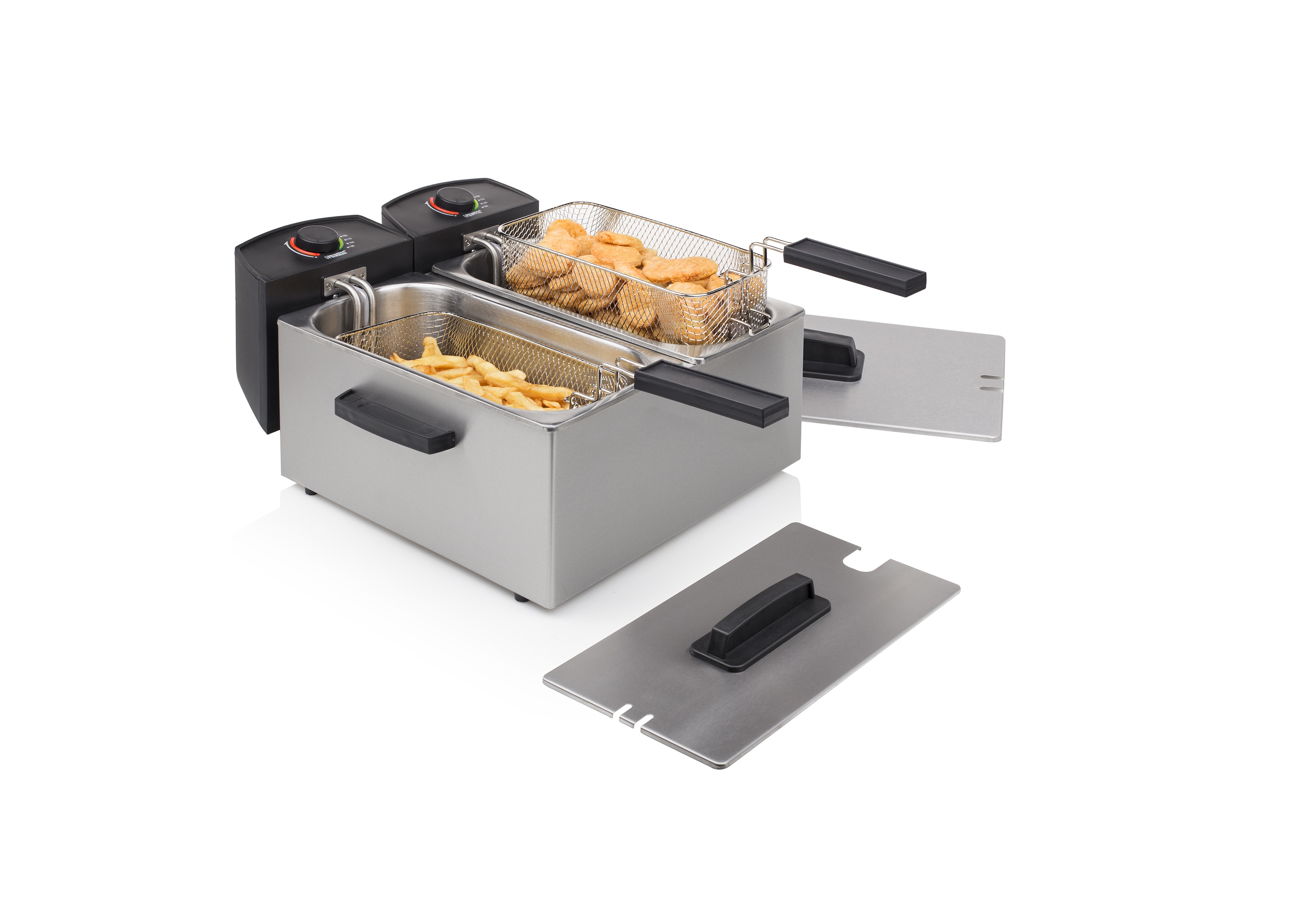Freidora doble Princess, 2 cestas con asa, 2 recipientes de acero inoxidable extraíbles, 2 filtros de aceite de seguridad, manual de instrucciones