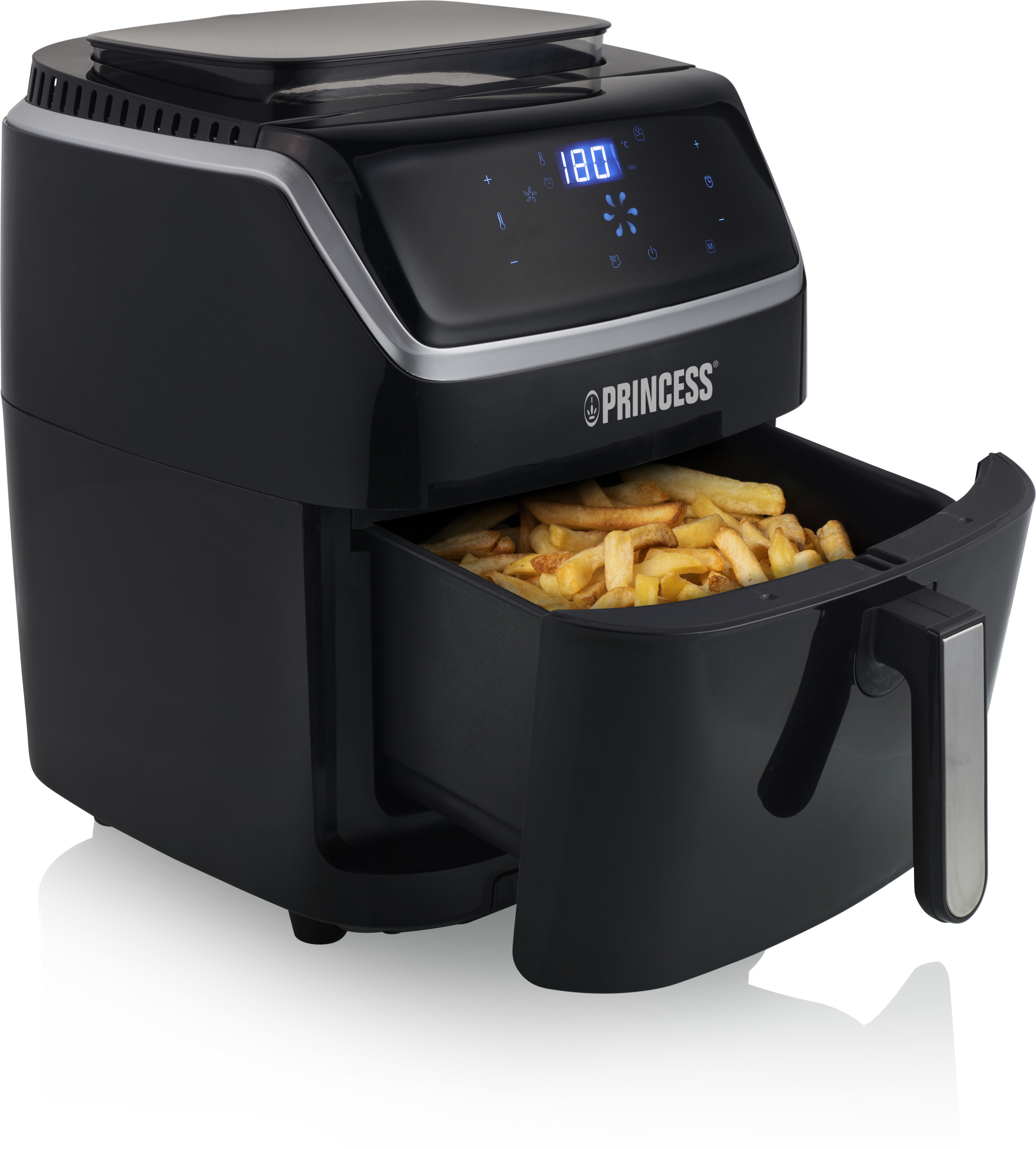 Con la nueva freidora sin aceite + vaporera 182080 de Princess, sus platos serán aún más saludables. Este producto innovador tiene una capacidad de 6,5 litros, por lo que podrá preparar comidas para toda la familia. ¿Viernes de patatas fritas o verduras al vapor con carne? Este electrodoméstico puede con todo.\n\nDiseño 2 en 1: freidora sin aceite + vaporera\nEste innovador producto de Princess es único en su especie. Se trata de una freidora sin aceite que viene con una vaporera incorporada para que pueda preparar platos más saludables. La cocción al vapor permite preparar comidas mucho más ricas, ya que conserva el color, la textura, la humedad, las vitaminas y los minerales de los alimentos. ¿Quiere hacer unas patatas al horno? Llene el recipiente del agua y cuézalas al vapor. Luego incorpora panceta (vegetariana) y fría ambos ingredientes sin aceite. Disfrute de ambas funciones en un único utensilio. Con la freidora sin aceite + vaporera de Princess podrá preparar un sinfín de platos y recetas.\n\nCapacidad de 6,5 litros\nGracias a su capacidad de 6,5 litros y su potencia de 1700 vatios, este producto será su mejor aliado en la cocina y tener varios comensales a la mesa ya no será un problema. Esta freidora sin aceite + vaporera tiene un rango de temperatura que va de los 40 a los 200 grados y un temporizador que llega hasta los 90 minutos. Ideal para controlar el tiempo de cocción.\n\nPanel digital completo\nLa freidora sin aceite + vaporera de Princess incluye un panel de control digital táctil, práctico e intuitivo con el que podrá definir fácilmente el tiempo y la temperatura de cocción. También incluye 8 programas predefinidos para preparar verduras al vapor, pollo, pescado, carnes rojas, pan, patatas fritas, pasta y arroz. ¿Le gusta desayunar pan recién hecho? Con la freidora sin aceite + vaporera, no necesitará una panificadora. ¡Ambas funciones se encargan de todo!\n\nVarios accesorios\nLa freidora sin aceite + vaporera de Princess incluye varios accesorios, entre ellos, una rejilla de vapor y una cesta para freír con revestimiento antiadherente. Todos los accesorios son fáciles de limpiar y aptos para el lavavajillas. Todo lo que necesita para cocinar de la forma más sencilla posible. ¿Necesita inspiración culinaria? En la caja encontrará un recetario que le ayudará a dar sus primeros pasos. ¿Ya ha preparado todas las recetas del libro? Visite el sitio web de recetas de Princess, cookwithprincess.com, para descubrir muchas más.\n\nContenido de la caja:\nFreidora sin aceite + vaporera de Princess, rejilla de vapor, cesta para la freidora, recetario, manual