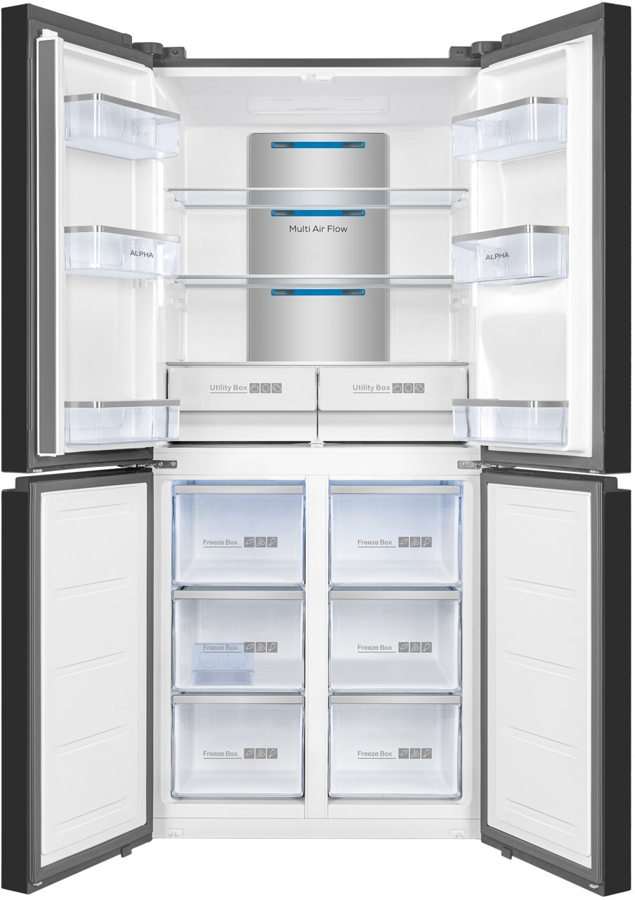 Nuestros frigoríficos son fabricados con los mejores materiales del mercado para conseguir la más alta calidad y durabilidad. Acabados en cristal templado negro con interiores elegantes y optimizados. Total No Frost con Multi Airflow (Expande el frio de forma constante por todo el frigorífico). AAT Fresh Technology (Función Bactericida, Purificadora y Antioxidante). Función de alarma de puerta abierta. Smart Inverter Motor (Ahorro Energético, Alta eficiencia y Bajo nivel sonoro). Metal Cooling. Iluminación interior mediante tiras led laterales. Incluye maquina manual para cubitos de hielo y 2 cajones para productos frescos. Estantes cromados. Tiene una altura de 185 cm, con un ancho de 86 cm y una profundidad de 67,8 cm, lo que ofrece una capacidad neta de 470 litros y una eficiencia energética E. 3 Años de garantía, con servicio de asistencia técnica para ayudarte con cualquier duda que puedas tener. Este producto está diseñado en España por ALPHA para que se adapte a todas tus necesidades. ENTREGA A PIE DE CALLE.