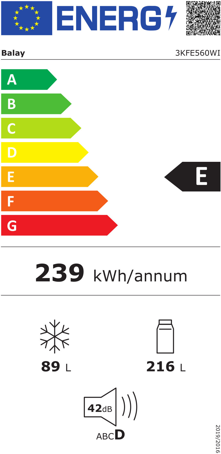 Balay 3KFE560WI. Capacidad neta total: 305 L. Bisagra para puerta: Derecho, Tipo de visualizador: LED. Clase climática: SN-T, Nivel de ruido: 42 dB. Frigorífico, capacidad neta: 216 L, Antiescarcha (nevera), Luz interior de la nevera, Frigorífico, número de compartimentos: 4. Congelador, capacidad neta: 89 L, Capacidad de congelación: 11 kg/24h, Antiescarcha (congelador). Clase de eficiencia de energía: E, Consumo de energía anual: 239 kWh. Color del producto: Blanco