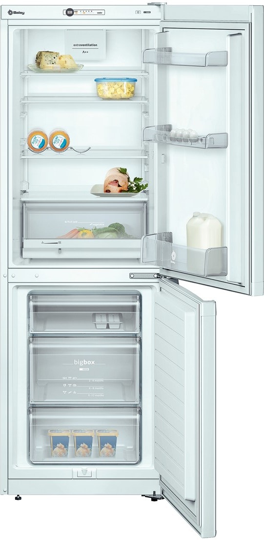 Balay 3KSB5410. Diseño: Independiente. Capacidad neta total: 288 L. Bisagra para puerta: Derecho. Clase climática: SN-T, Nivel de ruido: 39 dB. Frigorífico, capacidad neta: 194 L, Luz interior de la nevera, Frigorífico, número de compartimentos: 5, Número de compartimientos para verduras: 1. Congelador, capacidad neta: 94 L, Capacidad de congelación: 7 kg/24h. Clase de eficiencia de energía: A++, Consumo de energía anual: 219 kWh. Color del producto: Blanco