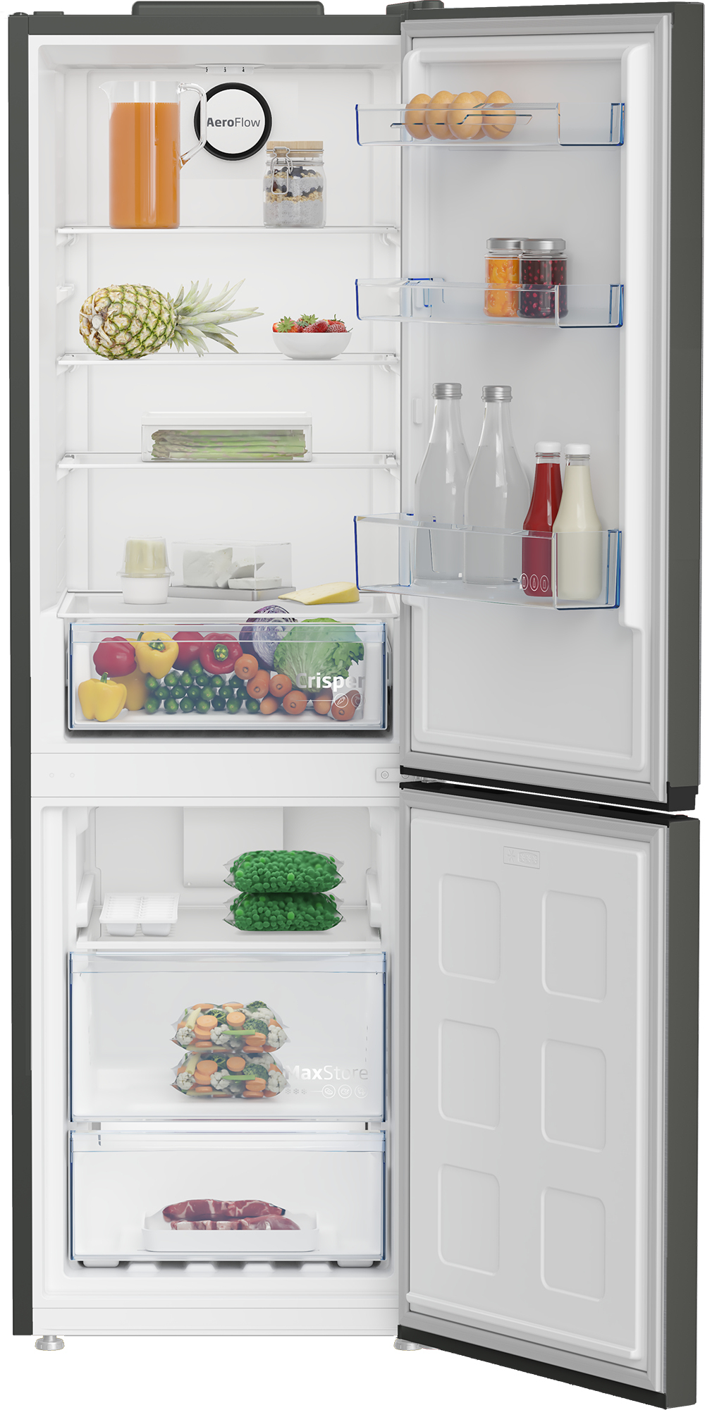 Beko B1RCNE364G. Capacidad neta total: 316 L. Bisagra para puerta: Derecho. Clase climática: SN-T, Nivel de ruido: 37 dB. Frigorífico, capacidad neta: 210 L, Antiescarcha (nevera), Sistema multi-flujo de aire (nevera), Luz interior de la nevera, Frigorífico, número de compartimentos: 3. Congelador, capacidad neta: 106 L, Capacidad de congelación: 6 kg/24h, Antiescarcha (congelador). Clase de eficiencia de energía: E, Consumo de energía anual: 247 kWh. Color del producto: Gris