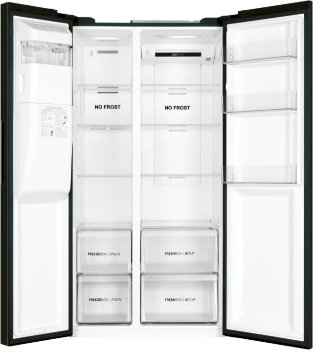 Haier SBS 90 Serie 3 HSR3918FIPB. Tipo de instalación: Independiente, Color del producto: Negro, Diseño de producto: Puerta americana. Capacidad neta total: 515 L, Clase climática: SN, Clase de emisión de ruido: C. Frigorífico, capacidad neta: 337 L. Congelador, capacidad neta: 178 L, Posición congelada: Lateral, Capacidad de congelación: 10 kg/24h. Longitud del cable: 2 m