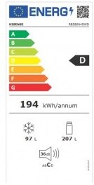 Especifiaciones: Cajón Frutas Y Verdura ConControl De Humedad SíMulti Airflow SíAlarma De Puerta Abierta SíCajón Frutas Y Verduras SíBotellero (Estante Interior) Sí Información Básica :Marca: HisenseCódigo Comercial: Rb390n4dwdCódigo Interno: 20011611Código Ean: 6921727072672Sistema De Control De Temperatura: DigitalOpción Instalación Integrable: NoColor Principal: BlancoVolumen Total: 304 LAlto Producto: 1860 MmAncho Producto: 595 MmProfundidad Producto: 590 MmAlto Embalado: 1935 MmAncho Embalado: 645 MmProfundidad Embalado: 628 MmPeso Producto: 63,0 KgPeso Embalado: 69,0 KgColor Frontal: Blanco / AceroColor Laterales: Blanco / Chapa Prepintada Información Adicional:Luminación Interior: SíModo Descongelación Frigorífico: No Frost (Automático)Modo Descongelación Congelador: No Frost (Automático)Enfriamiento Rápido: N/AAlarma Puerta Abierta: SíCantidad De Cajones En Congelador: 3Producción De Hielo Automático: NoBotellero (Estante Interior): SíCantidad Estantes En Frigorífico: 2Compartimento Frutas Y Verduras: SíOpción Puerta Reversible: Sí Información Eficiencia:Consumo Energía Anual: 194,0 Kwh/AClase Emisión De Ruido: CVolumen Total Congelador: 97 LVolumen Total: 304 LClase Eficiencia Energética: DVolumen Total Frigorífico: 207,0 LClase Climática: N, T, St, SnNivel De Ruido: 36 Db Re 1 PwCongelamiento Rápido: Sí