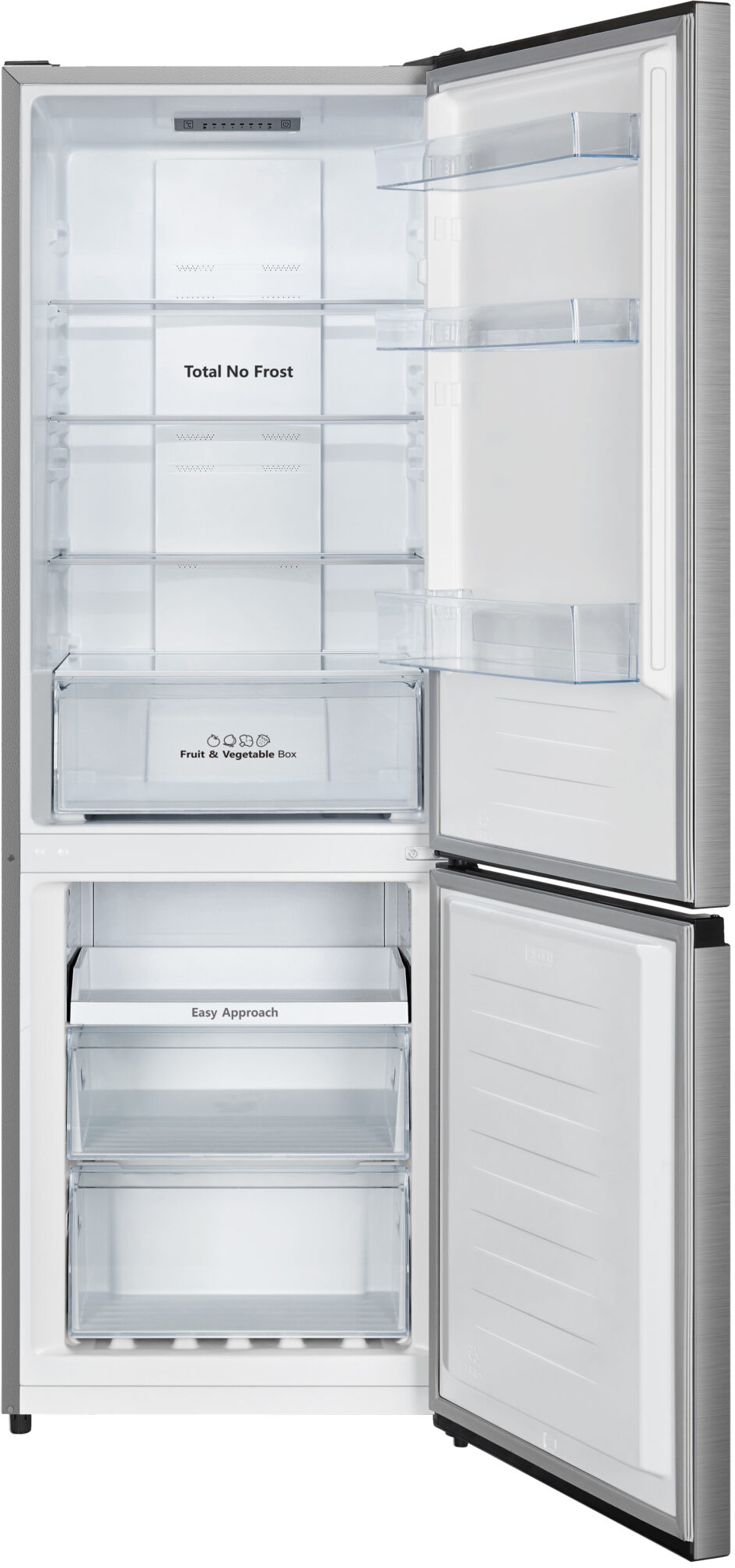 Eficiencia Energética\nEn Hisense constantemente estamos desarrollando productos más respetuosos con el medio ambiente, más eficientes y que reducen el consumo energético y ahorran dinero.\n\nMulti-Air Flow\nTemperatura óptima constante para conservar los alimentos frescos por más tiempo.\n\nMicro Vents Cooling\nPequeñas micro perforaciones que inyectan aire frío en distintas alturas del frigorífico asegurando las mejores condiciones en todos los rincones.\n\nTotal No Frost\nEvita la formación de escarcha tanto en el frigorífico como en el congelador.\n\nCajón Frutas y Verduras con Control de Humedad\nPermite controlar el nivel de humedad para preservar las frutas y verduras frescas y deliciosas por más tiempo.\n\nSuper Freeze\nReduce rápidamente la temperatura preservando los alimentos en óptimas condiciones por más tiempo.\n\nModo Vacaciones\nDisfruta de unas merecidas vacaciones sin preocupaciones y ahorrando energía. El frigorífico funcionará a una temperatura constante de 15ºC.\n\nControl Táctil\nCompleto control con panel electrónico LED de fácil uso que permite. elegir la temperatura deseada y seleccionar las funciones especiales.\n\nIluminación LED\nMayor visibilidad y menor consumo de energía utilizando tecnología LED que ilumina todo el interior de forma agradable a la vista.\n\nApertura 90º y Puerta Reversible\nDiseño especial desarrollado para: (1) ofrecer acceso completo al interior aún cuando exista una apertura limitada a solo 90º y/o (2) flexibilidad de apertura hacia la izquierda o la derecha según cada necesidad.\n\nMetal Back\nPanel metálico que cubre la parte trasera del frigorífico ofreciendo mayor seguridad y protección.