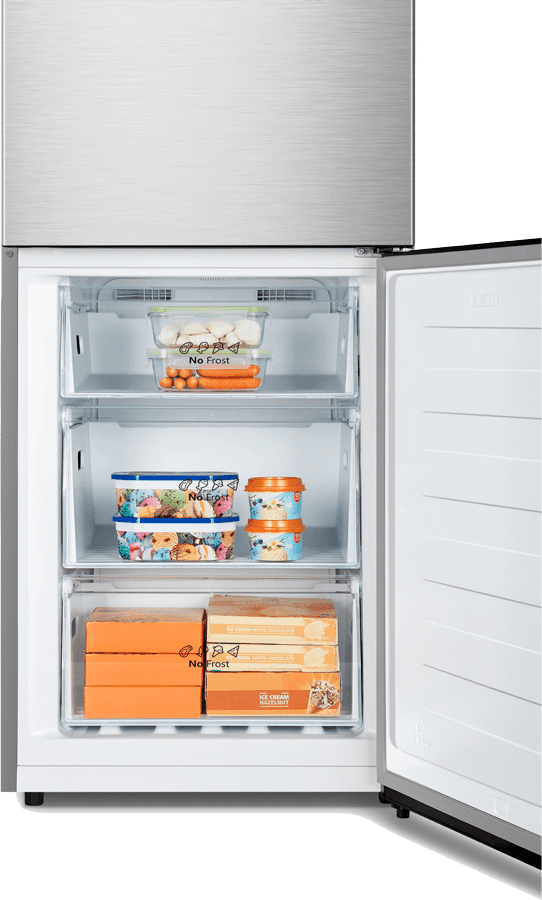 BOTELLERO\nUn espacio de lujo dedicado en exclusiva para los vinos y licores que se sirven fríos. Ahorra espacio en los estantes laterales y evita que las botellas se muevan en las baldas.\n\nCajón frutas y verduras con control de humedad\nLa humedad del interior del cajón se puede ajustar fácilmente dependiendo del tipo de alimentos almacenados.\n\nCajón frutas y verduras\nCompartimento especifico de frutas y verduras, humedad ideal, frescos mas tiempo.\n\nCajones Freshzone\nEl cajón Fresh Zone es ideal para guardar productos frescos como fruta y verdura en perfectas condiciones. Además, el diseño transparente permite ver fácilmente lo que hay dentro sin necesidad de abrir el cajón.\n\nIluminación LED\nLos frigoríficos Hisense integran tecnología LED para la iluminación interior. Comparadas con las bombillas incandescentes, las LED aportan menos calor, más brillo y ahorro energético\n\nTrasera metálica Metal Back\nEstos frigoríficos están fabricados con un respaldo de metal para mayor seguridad y protección. También permite colocar el aparato firmemente contra la pared.\n\nMulti Airflow\nGracias a la distribución uniforme de aire frío conseguida por el sistema Multi Air Flow de Hisense, la temperatura óptima se mantiene constante a través de todo el frigorífico para mantener los alimentos frescos por más tiempo, sin importar el sitio donde se encuentren.