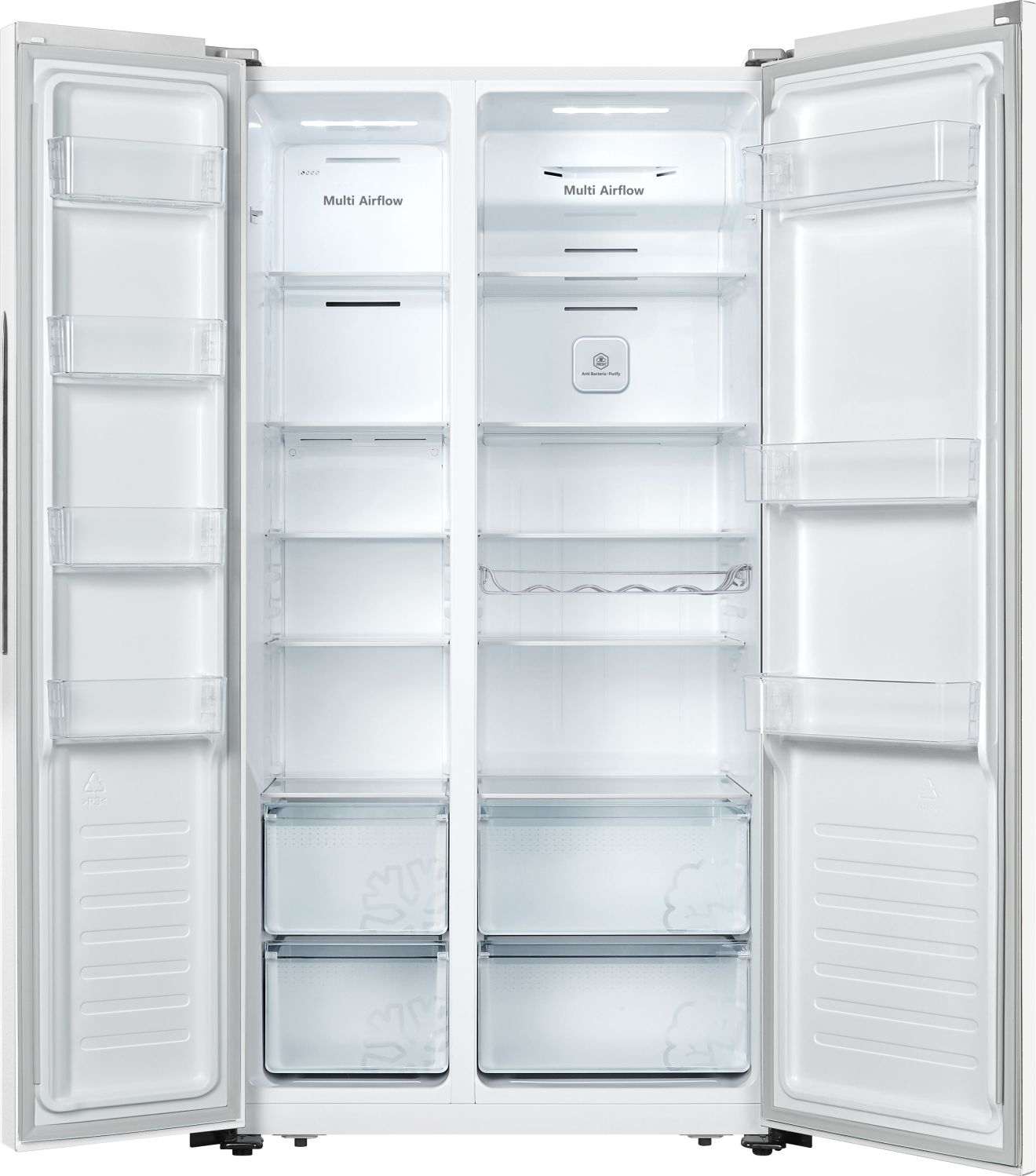 Hisense RS677N4AWF. Tipo de instalación: Integrado/Independiente, Color del producto: Blanco, Diseño de producto: Puerta americana. Capacidad neta total: 519 L, Clase climática: SN-ST, Clase de emisión de ruido: D. Frigorífico, capacidad neta: 334 L. Congelador, capacidad neta: 185 L, Posición congelada: Lateral, Capacidad de congelación: 11 kg/24h. Clase de eficiencia de energía: E, Consumo de energía anual: 309 kWh, Escala de eficiencia energética: De la A a la G
