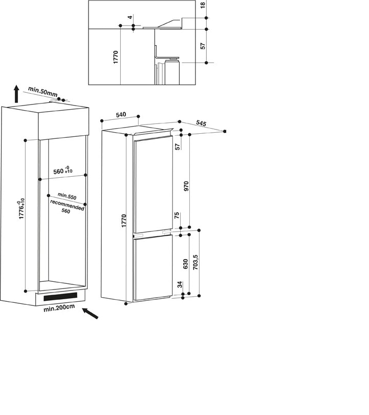 Hotpoint BCB 7030 E C AAA 03. Diseño: Integrado, Bisagra para puerta: Derecho. Clase climática: ST-T, Nivel de ruido: 35 dB. Luz interior de la nevera, Frigorífico, número de compartimentos: 3, Número de compartimientos para verduras: 2. Capacidad de congelación: 6 kg/24h. Clase de eficiencia de energía: A++, Consumo de energía anual: 251 kWh. Color del producto: Blanco