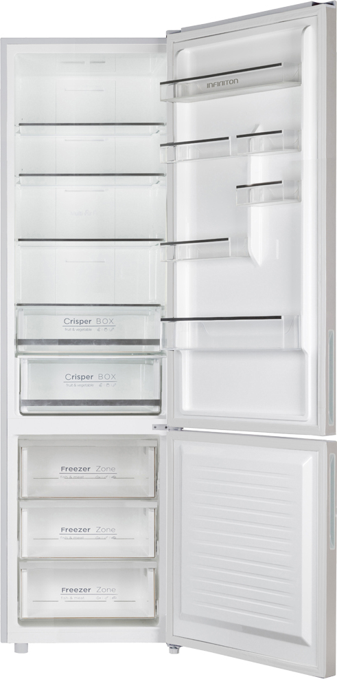 Acabado Cristal White\nEficiencia y diseño, ahora pueden ir de la mano. No dudes en comprar tu frigorífico combi Infiniton con acabado en cristal blanco. Tu cocina representará la vanguardia en tecnología y el diseño. Diseñado en España, creyendo la diferenciación y la originalidad.\n\nControl de temperatura\nBizona on door\nEn la puerta, puedes encontrar un display para controlar la temperatura tanto del refrigerador como del congelador, haciendo selección de sus diferentes modos y temperaturas.\n\nNo Frost Total\nSe acabaron las escarchas\nEsta tecnología evita que requiera la descongelación del congelador, a la vez que restringe la formación de moho o malos olores.\nSe compone por un motor, un evaporador y un dispositivo de ventilación que bloquea la formación de las escarchas y los vapores generados por los alimentos.\n\nGran capacidad\n2 metros de altura\nTus alimentos más frescos que nunca. Los Combi de Infiniton te sorprenderán. Están diseñados para cubrir cualquier necesidad, en este caso, la de la falta de espacio, para ser más concretos hasta 351 litros de espacio.\n\nCompresor Inverter\nTecnología avanzada\nEl compresor inverter controla la velocidad del mismo ayudándote a ahorrar energía. Al ir a una baja frecuencia, el compresor no produce cambios de velocidad dispares que se traducen en saltos en la temperatura que genera el producto.\n\nClasificación energética A++\nObtendrás un gran ahorro en la factura eléctrica, gracias a su bajo consumo eléctrico. A parte, al contener el sistema inverter, tendrá una vida más larga en cuanto a funcionamiento se refiere.\n\nSe acabó descongelar manualmente\nInfiniton te ofrece el combi perfecto, tanto si debes de conservar mucha cantidad de comida como si tienes que conservar poca. Con el sistema No frost total, tendrás espacio para almacenar todo lo que te puedas imaginar, organizarlo a tu gusto y además te olvidarás de descongelar manualmente ya que lo hace por sí solo. Así, de simple y fácil. Dedica tu tiempo a lo que realmente importa, pero no a descongelar tu frigorífico.\n\nMás vida para tus alimentos\nDebido al sistema No Frost, el círculo que genera de frescura por todo el frigorífico repercutirá de manera muy positiva en la duración de tus alimentos ya que se conservarán mejor y por lo tanto estarán durante más tiempo frescos.\n\nGana espacio\nBotellero de gran altura\nGracias al botellero en puerta, podrás guardar cualquier tipo de botella, ya que no tendrás problema con el espacio, en cuanto a altura se refiere, preparado para refrigerar cualquier tipo de tamaño de botella.\n\nAcabados de alta calidad en aluminio\nGracias a los acabados en aluminio, el interior de frigorífico lucirá más moderno, será más resistente y por lo tanto, más duradero. Diseño y calidad van de la mano.\n\nUna luz Perfecta\nPara ver todo el interior\nCon la iluminación LED que complementan los combis Infiniton, no tendrás problemas de v
