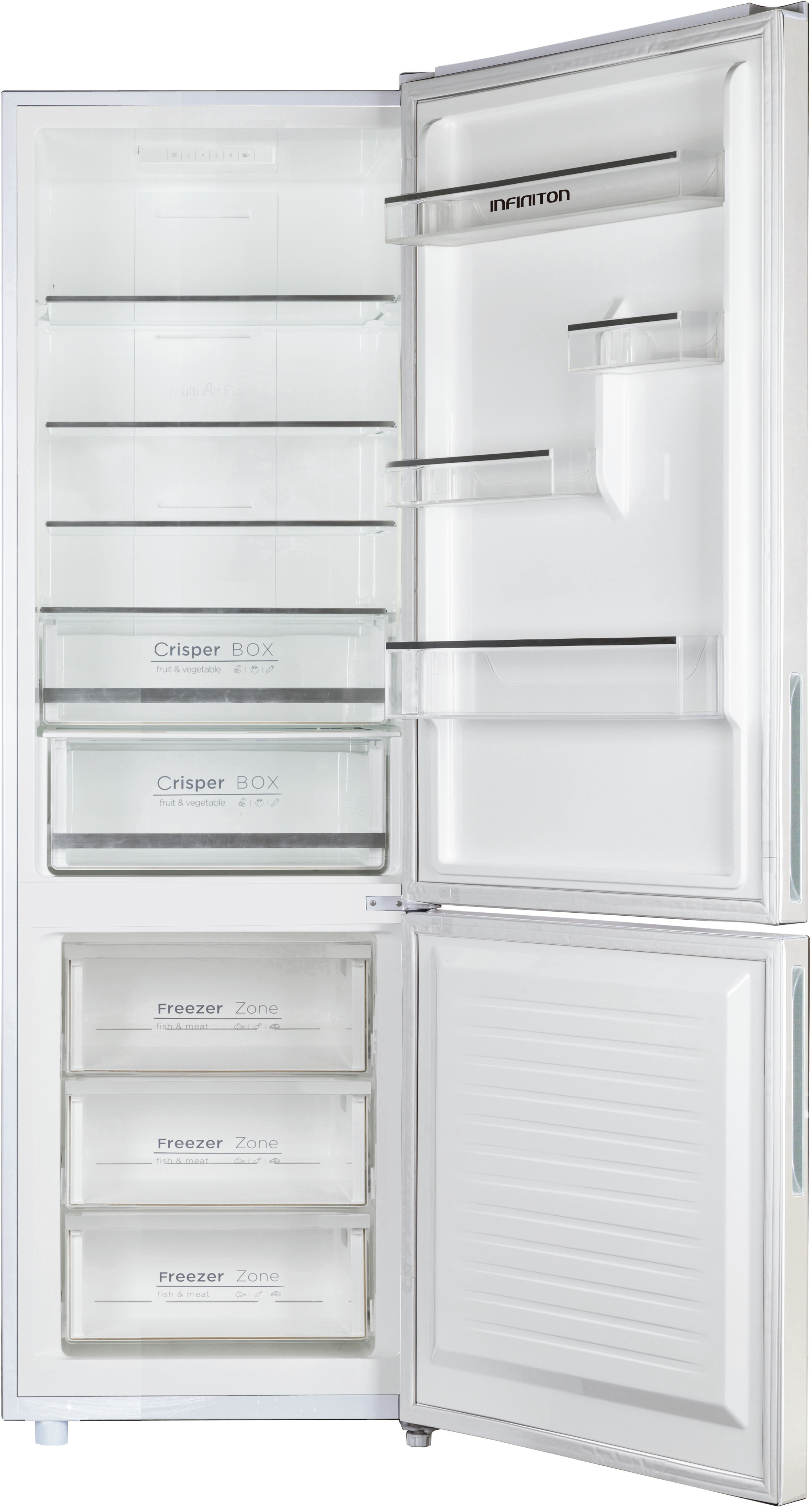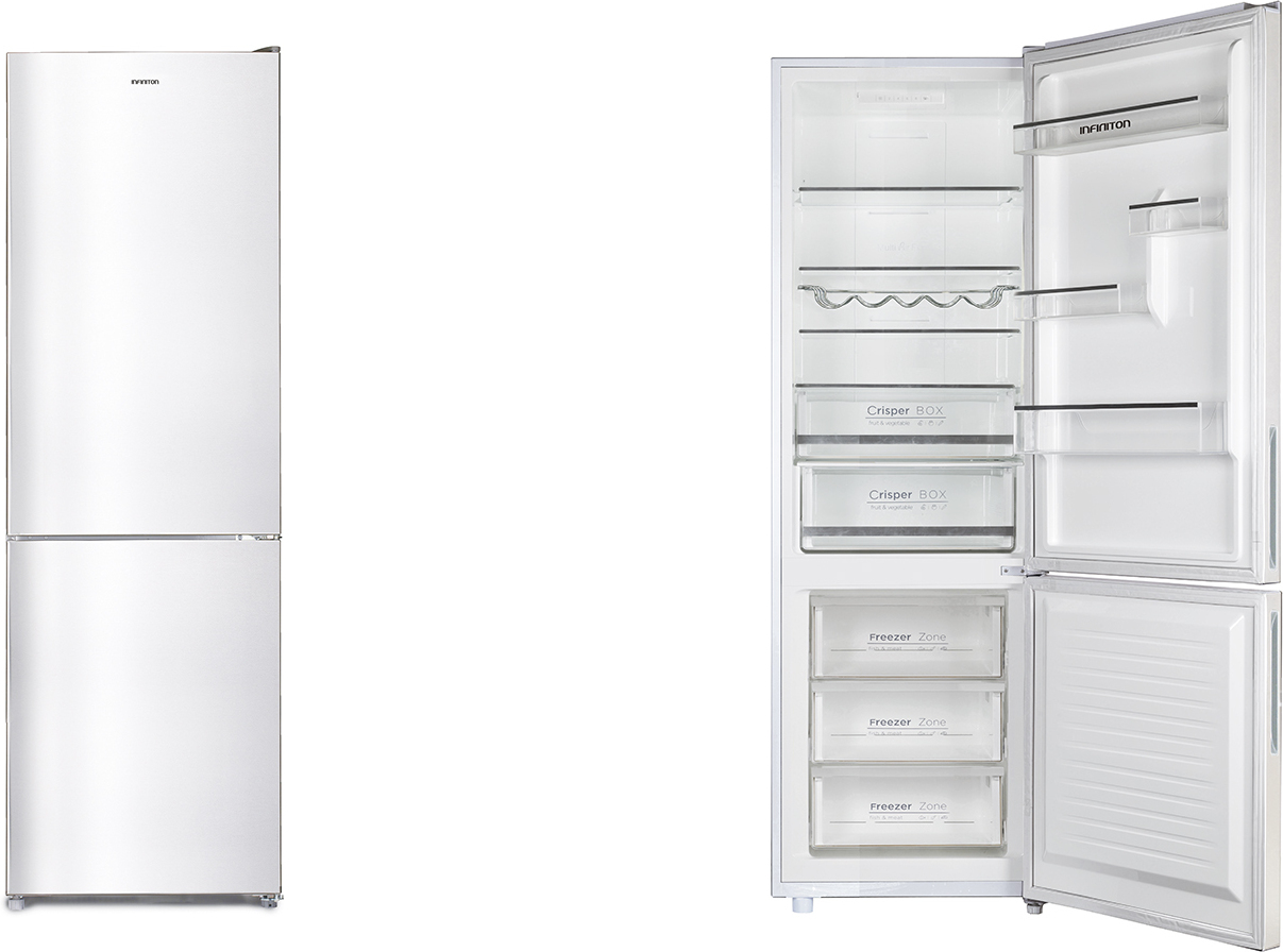 Infiniton FGC-320W. Capacidad neta total: 317 L. Bisagra para puerta: Derecho. Nivel de ruido: 42 dB. Frigorífico, capacidad neta: 223 L, Antiescarcha (nevera), Luz interior de la nevera, Frigorífico, número de compartimentos: 4, Número de compartimientos para verduras: 2. Congelador, capacidad neta: 94 L, Antiescarcha (congelador). Compartimiento de zona fresca. Clase de eficiencia de energía: A+, Consumo de energía anual: 307 kWh. Color del producto: Blanco