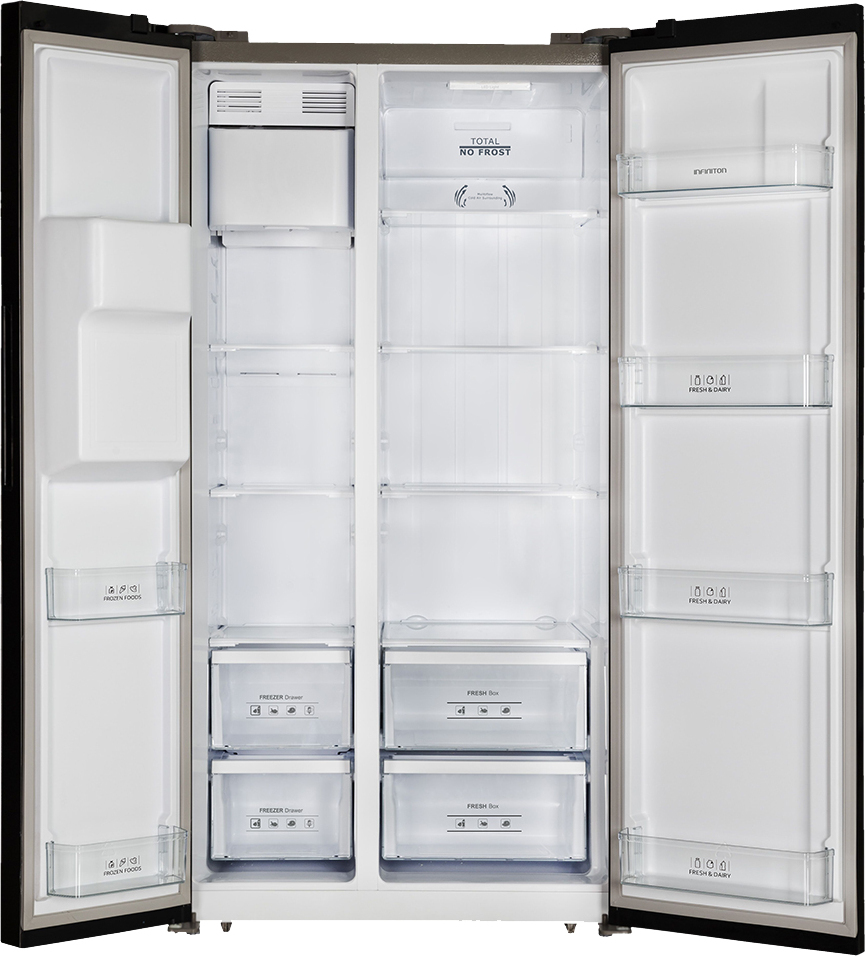 Acabado INOX\nDe primera calidad\nLos acabados de este americano son de acero inoxidable de primera calidad, evitando así el desgaste notorio que se puede producir con el paso del tiempo o por el uso diario.\n\nControl de temperatura\nBizona on door\nEn la puerta, puedes encontrar un display para controlar la temperatura tanto del refrigerador como del congelador, haciendo selección de sus diferentes modos y temperaturas.\n\nAcabados de alta calidad en aluminio\nDiseño y calidad\nGracias a los acabados en aluminio, el interior de frigorífico lucirá más moderno, será más resistente y por lo tanto, más duradero.\n\nSimple, fácil, así es Infiniton.\n\nNo Frost TOTAL\nSe acabaron las escarchas\n\nEsta tecnología evita que requiera la descongelación del congelador, a la vez que restringe la formación de moho o malos olores.\n\n\nSe compone por un motor, un evaporador y un dispositivo de ventilación que bloquea la formación de las escarchas y los vapores generados por los alimentos.\n\nDispensador de agua y hielo\nNo volverás a tener sed\nEn la puerta, puedes encontrar un dispensador que te proporcionará tanto agua fría, como hielo picado o hielo sin picar, lo que tú prefieras o necesites, siempre listo a solo un click.\n\nLuces LED\nTodo su interior iluminado\nPodrás navegar al igual de día que de noche en tu frigorífico, sin ningún problema de luz o de visibilidad en cada uno de los balcones, compartimentos o espacios ofrecidos por el americano.\n\nCongelador extra-grande\nAdiós a los problemas de espacio\nDebido a su congelador extra-grande podrás disfrutar de tener la opción de dividir tu comida por secciones dependiendo del tipo que sea, logrando una distribución total y evitando cualquier problema de espacio.\n\nClasificación energética A+\nObtendrás un gran ahorro en la factura eléctrica, gracias a su bajo consumo eléctrico. A parte, al contener el sistema inverter, tendrá una vida más larga en cuanto a funcionamiento se refiere.\n\nMás vida para tus alimentos\nDebido al sistema No Frost, el círculo que genera de frescura por todo el frigorífico repercutirá de manera muy positiva en la duración de tus alimentos ya que se conservarán mejor y por lo tanto estarán durante más tiempo frescos.\n\nDiseño interior perfecto\nBotellero de gran altura\nGracias al botellero de gran altura situado en la puerta, no tendrás problema para guardar cualquier tipo de botella, de envase, o producto alto y delicado. En Infiniton, todo está pensado para tu confort y usabilidad desde el diseño hasta el interior de tu frigorífico.\n\nSe acabó descongelar manualmente\nInfiniton te ofrece el combi perfecto, tanto si debes de conservar mucha cantidad de comida como si tienes que conservar poca. Con el sistema No frost total, tendrás espacio para almacenar todo lo que te puedas imaginar, organizarlo a tu gusto y además te olvidarás de descongelar manualmente ya que lo hace por sí solo. Así, de si