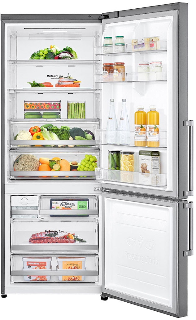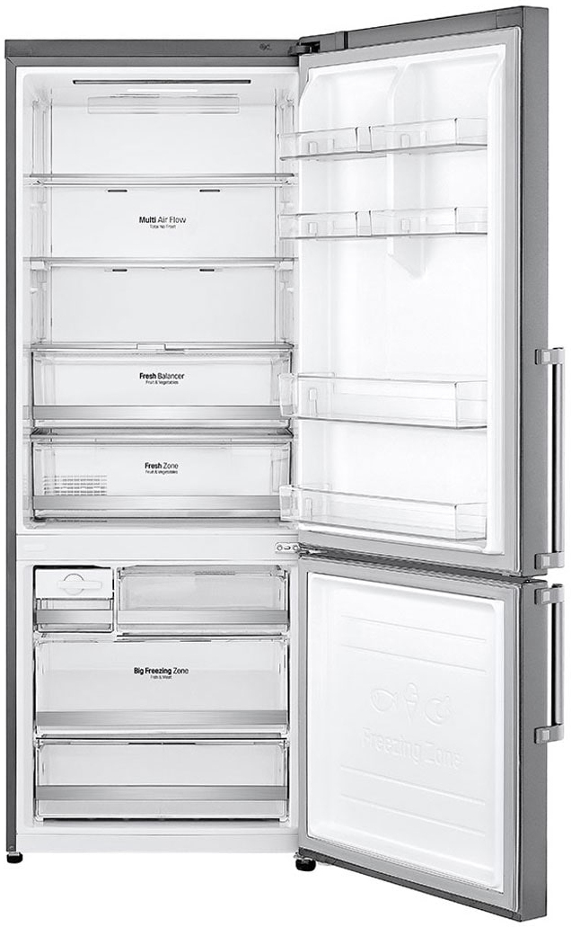LG GBB567PZCMB. Capacidad neta total: 462 L. Bisagra para puerta: Derecho. Clase climática: SN-T, Nivel de ruido: 41 dB. Frigorífico, capacidad neta: 329 L, Antiescarcha (nevera), Sistema multi-flujo de aire (nevera), Luz interior de la nevera, Frigorífico, número de compartimentos: 4. Congelador, capacidad neta: 133 L, Capacidad de congelación: 15 kg/24h, Antiescarcha (congelador). Clase de eficiencia de energía: E, Consumo de energía anual: 282 kWh. Color del producto: Acero inoxidable