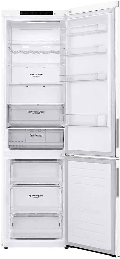 LG GBB62SWGCC. Capacidad neta total: 419 L. Bisagra para puerta: Derecho. Clase climática: SN-T, Nivel de ruido: 35 dB. Frigorífico, capacidad neta: 277 L, Luz interior de la nevera, Frigorífico, número de compartimentos: 4, Número de compartimientos para verduras: 2. Congelador, capacidad neta: 107 L, Capacidad de congelación: 10 kg/24h. Clase de eficiencia de energía: C, Consumo de energía anual: 172 kWh. Color del producto: Blanco
