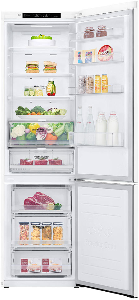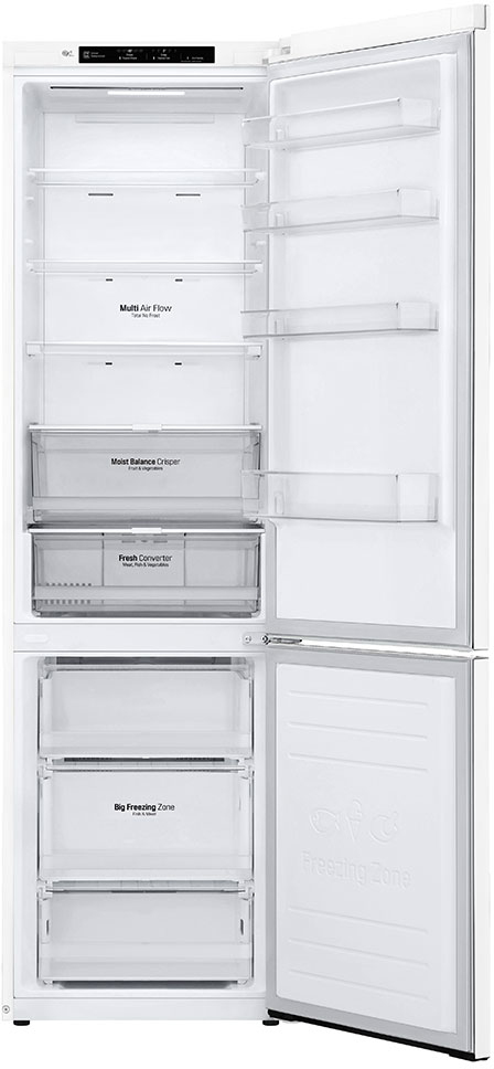 LG GBB62SWGFN. Diseño: Independiente, Bisagra para puerta: Izquierda. Clase climática: SN-T, Nivel de ruido: 36 dB. Frigorífico, capacidad neta: 277 L, Antiescarcha (nevera), Sistema multi-flujo de aire (nevera), Luz interior de la nevera. Congelador, capacidad neta: 107 L, Capacidad de congelación: 14 kg/24h, Antiescarcha (congelador). Compartimiento de zona fresca. Clase de eficiencia de energía: A+++, Consumo de energía anual: 193 kWh. Color del producto: Blanco