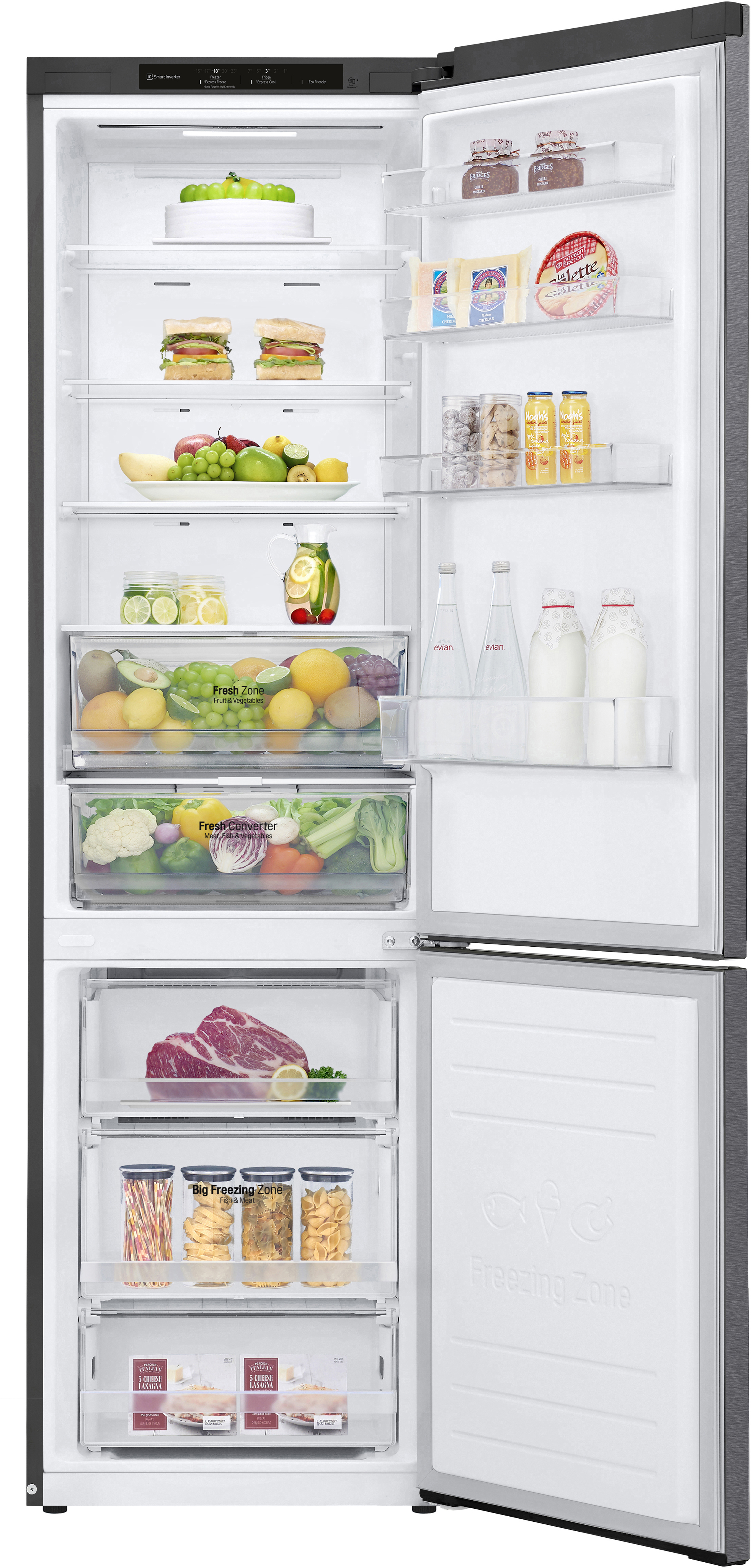 LG GBP62DSNGN. Capacidad neta total: 384 L. Bisagra para puerta: Derecho, Tipo de visualizador: LED. Clase climática: SN-T, Nivel de ruido: 35 dB. Frigorífico, capacidad neta: 277 L, Antiescarcha (nevera), Sistema multi-flujo de aire (nevera), Luz interior de la nevera. Congelador, capacidad neta: 107 L, Capacidad de congelación: 10 kg/24h, Antiescarcha (congelador). Clase de eficiencia de energía: D, Consumo de energía anual: 215 kWh. Color del producto: Grafito