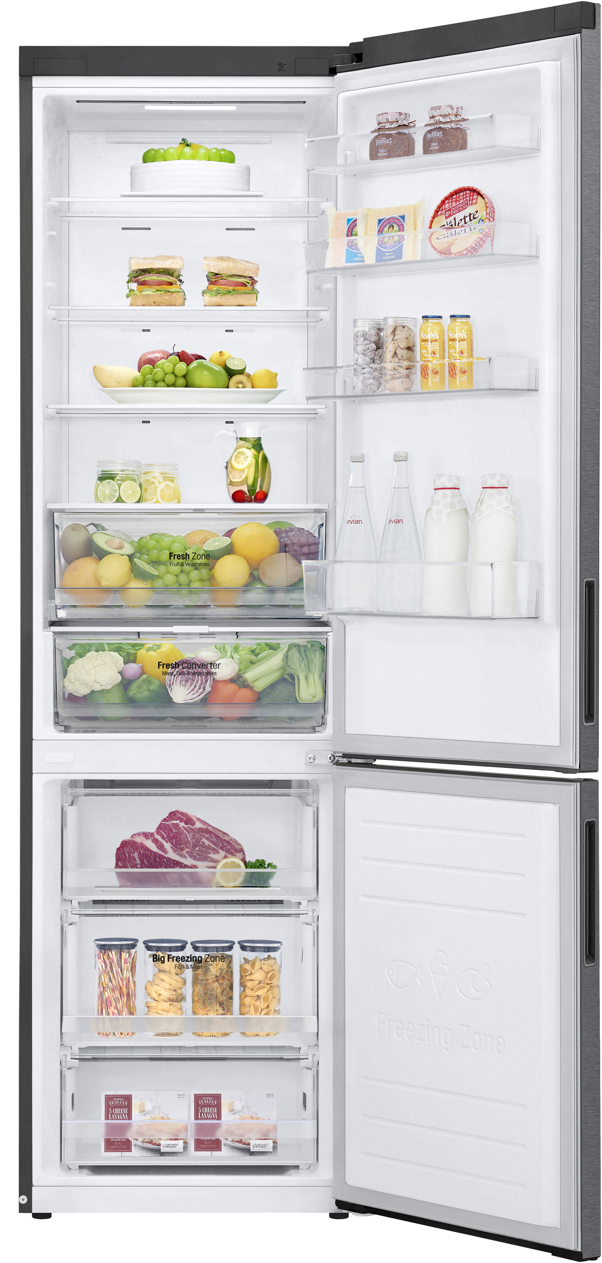 LG GBP62DSXCC1. Capacidad neta total: 384 L. Bisagra para puerta: Derecho, Tipo de visualizador: LED. Clase climática: SN-T, Nivel de ruido: 35 dB. Frigorífico, capacidad neta: 277 L, Antiescarcha (nevera), Sistema multi-flujo de aire (nevera), Luz interior de la nevera. Congelador, capacidad neta: 107 L, Capacidad de congelación: 10 kg/24h, Antiescarcha (congelador). Compartimiento de zona fresca. Clase de eficiencia de energía: C, Consumo de energía anual: 172 kWh