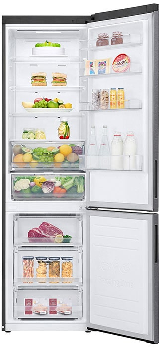 LG GBP62DSXGC. Capacidad neta total: 384 L. Tipo de visualizador: LED. Clase climática: SN-T, Nivel de ruido: 35 dB. Frigorífico, capacidad neta: 277 L, Sistema multi-flujo de aire (nevera), Luz interior de la nevera, Frigorífico, número de compartimentos: 3. Congelador, capacidad neta: 107 L, Capacidad de congelación: 10 kg/24h. Clase de eficiencia de energía: D, Consumo de energía anual: 215 kWh. Color del producto: Grafito