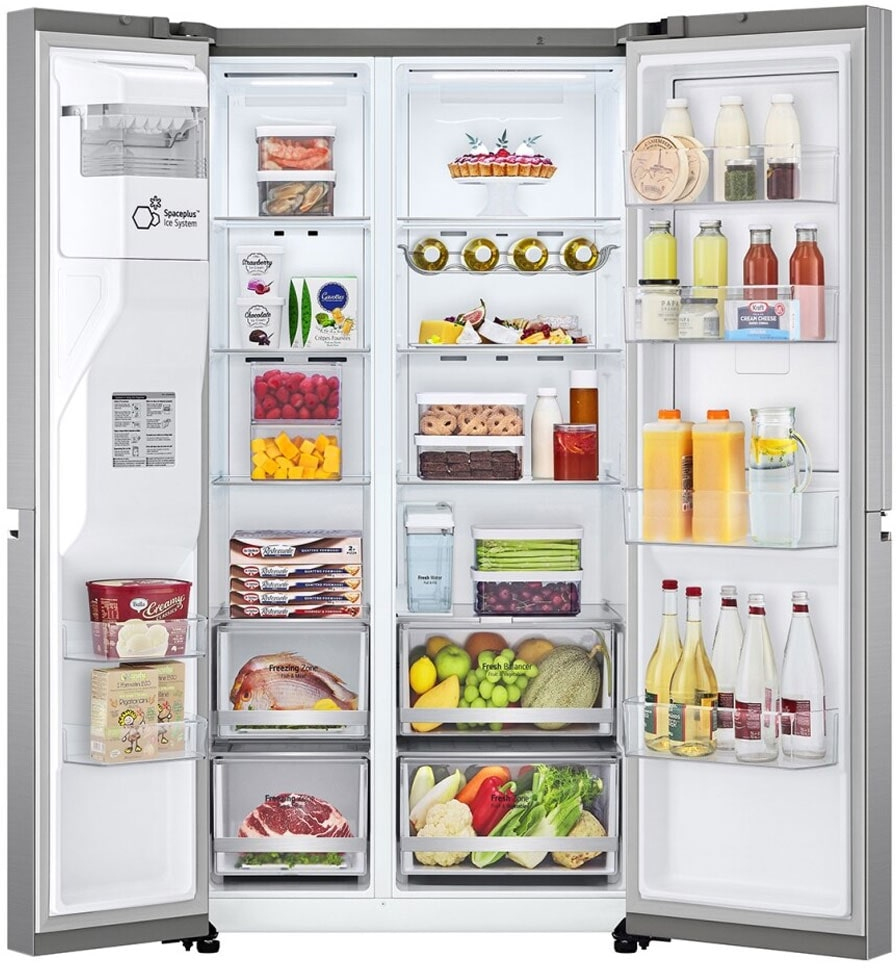 LG GSJV71PZLE edelstahl. Tipo de instalación: Independiente, Diseño de producto: Puerta americana, Color del producto: Acero inoxidable. Capacidad neta total: 635 L, Clase climática: T, Clase de emisión de ruido: C. Frigorífico, capacidad neta: 416 L. Congelador, capacidad neta: 219 L, Posición congelada: Lateral, Capacidad de congelación: 12 kg/24h. Clase de eficiencia de energía: E, Consumo de energía anual: 350 kWh