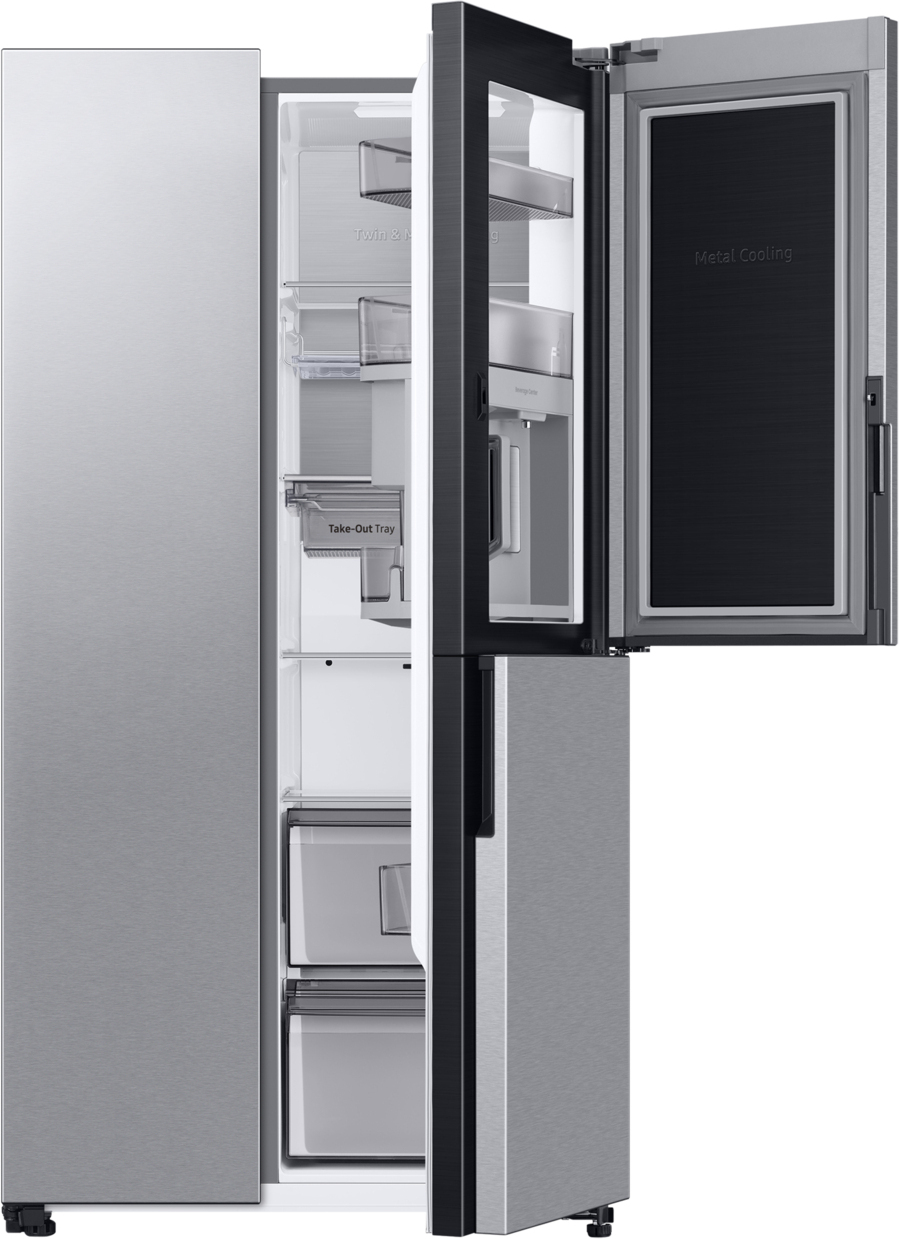 Enfriamiento constante y eficiencia energética\nCompresor mejorado de alta eficiencia\nAjusta automáticamente la temperatura y humedad entre 7 niveles según tus necesidades, lo que supone un ahorro energético y además, cuenta con 20 años de garantía[1].\n\nSmartThings Energy\nUso eficiente de la energía. Ahorro inteligente.\nGestiona tu consumo energético, ahorra energía y haz un seguimiento de tu huella de carbono. SmartThings Energy[2] te ofrece consejos de eficiencia energética, controla el consumo de energía de los electrodomésticos[3] en tiempo real, lo compara con el mes anterior y avisa si se superan tus objetivos.\n\nSmartThings Home Care\nMantenimiento inteligente y sencillo\nCuidar de tu frigorífico es muy fácil. SmartThings Home Care[4] monitoriza tanto su estado como el del filtro del agua y te ofrece alertas en tiempo real. También te avisa automáticamente si hay que sustituir piezas o se detectan problemas, y te sugiere una solución.\n\nSmartThings Food\nCocina inteligente. Platos deliciosos.\nGestiona, prepara y compra la comida de forma más eficiente con SmartThings Food[5]. Crea una lista de la comida que hay en tu frigorífico y gestiona sus fechas de caducidad. Podrás comprobar lo que tienes y lo que te hace falta siempre que quieras. También te recomienda recetas personalizadas.\n\nFresco y húmedo\nTwin Cooling™\nDoble circuito de refrigeración. No mezcla olores ni sabores y mantiene un nivel de humedad óptimo (65%~70%).\n\n5 modos de conversión\nSmart Conversion™\nDisfruta de lo último en almacenamiento flexible con la función Smart Conversion™. Twin Cooling te permite elegir entre 5 modos como convertir tu congelador en un frigorífico para almacenar más alimentos frescos o apagar el frigorífico o el congelador[6] para ahorrar energía.\n\nTu comida, aún más fresca\nMetal Cooling\nPlaca metálica en el interior del frigorífico que reduce la dispersión del frío, ayudando a conservar y restaurar la temperatura original, independientemente de cuántas veces abras y cierres la puerta.\n\nFrescura definitiva\nEnfriamiento preciso\nConserva la frescura, sabor y textura de los alimentos durante + tiempo. Cada compartimento tiene refrigeración independiente para enfriar de manera uniforme. El aislamiento avanzado reduce cualquier fluctuación sin importar el calor o el frío que haga fuera y dispone de tecnología Digital Inverter.\n\nEnfría y congela rápidamente\nPower Cool / Power Freeze\nCon un solo botón, el aire frío entrará más rápido en el frigorífico y el congelador, para enfriar tus bebidas o hacer hielo en menos tiempo.\n\nMás espacio para la comida\nMayor capacidad con SpaceMax™ Technology\nAlmacena más alimentos gracias a los 645L de capacidad. Gracias a la tecnología exclusiva SpaceMax™ las paredes son más finas, ofreciendo más espacio de almacenamiento sin aumentar las dimensiones externas. Tener el centro de bebidas en el frigorífico aumenta la capacidad del co