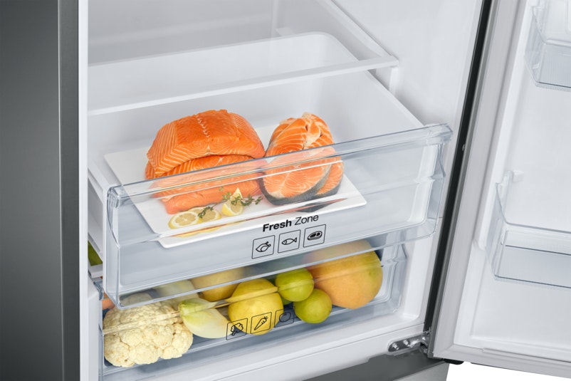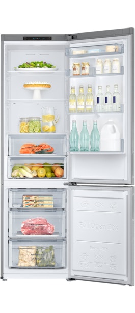 Más capacidad en el mismo espacio\nEl nuevo frigorífico de Samsung te ofrece más espacio de almacenamiento que los modelos convencionales, pero sin aumentar sus medidas standard exteriores. La tecnología Space Max disminuye el grosor de sus paredes maximizando su capacidad y manteniendo todas las garantías de refrigeración y optimización energética.\n\nSistema All-Around Cooling\nEl sistema All-Around Cooling se encarga de enfriar cada equina del frigorífico mediante múltiples orificios de refrigeración situados en las baldas. De este modo, consigue una temperatura constante y homogénea que mantiene tus alimentos siempre frescos.\n\nCarne y pescado en su punto justo\nLa zona 0º Fresh está diseñada para preservar la carne y el pescado, manteniendo la temperatura óptima que garantice su frescura y sabor.\n\nOrdena tu frigorífico a tu gusto\nLas baldas de su puerta son ajustables para que las coloques como tú quieras. De ese modo, podrás almacenar incluso las botellas y bricks más grandes, y darle la flexibilidad que necesites a sus compartimentos.\n\nCajones con apertura completa\nCuenta con cajones extra grandes que nos facilitan el acceso a los alimentos y la organización interior del congelador.\n\nIluminación LED\nLa luz LED de su interior es capaz de iluminar por completo el frigorífico sin afectar a su capacidad de refrigeración.\n\nFuncionamiento inteligente y duradero\nEl compresor Digital Inverter de Samsung ajusta automáticamente su velocidad, entre 7 niveles, según la temperatura del entorno. Esto hace posible que el frigorífico utilice menos energía, reduzca el ruido y aumente su durabilidad. La calidad de sus componentes y el diseño son óptimos, proporcionando una garantía de 10 años.\n\nOlvídate de la escarcha\nLa tecnología No Frost que integra el frigorífico está pensada para mantener su interior a una temperatura constate y evitar que aparezca la temida escarcha. Además, enfría el doble de rápido, por lo que el sistema de refrigeración no tiene que trabajar tanto y aumenta así su durabilidad.