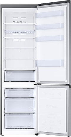 Máxima capacidad en el mismo espacio\nTecnología SpaceMax\nMás espacio interior manteniendo el mismo tamaño exterior. Samsung ha reducido el grosor de las paredes maximizando la capacidad interior alcanzando hasta 385 litros de capacidad neta\n\nEnfría cada esquina por igual\nAll-Around Cooling\nCada compartimento del frigorífico se enfría por igual, de esquina a esquina, gracias al aire frío que sale por las ranuras dispuestas en cada balda. Por lo tanto, cada producto de cada estante se enfría por igual y se mantiene más fresco.\n\nAdiós a la escarcha\nNo Frost\nNo pierdas el tiempo y energía descongelando el frigorífico. La tecnología No Frost optimiza la circulación del aire para mantener una temperatura constante, evitando la acumulación de escarcha. También enfría mucho más rápido, optimizando el trabajo del sistema de refrigeración y aumentando su durabilidad.\n\nEnfría y congela cuando tu quieras\nPower Cool / Power Freeze\nCon solo tocar un botón, la función Power Cool expulsa aire frío intensamente dentro del frigorífico para enfriar rápidamente tus alimentos o tus bebidas favoritas. Power Freeze envía una ráfaga de aire frío al congelador. Es ideal para congelar alimentos rápidamente o hacer hielo.\n\nAlmacena bebida y comida con total libertad\nBalda botellero\nAprovecha más el espacio de tu frigorífico con un botellero multifuncional. En él podrás no solo almacenar botellas de tamaño estándar, sino también botellas más finas, como las de champán. Además, su forma más plana también lo hace mucho más versátil, ya que podrás guardar otros alimentos, como pizzas y cajas de huevos.\n\nMenos ruido y consumo\nTecnología Digital Inverter\nMenos ruido y mayor eficiencia energética. El compresor Digital Inverter ajusta automáticamente la velocidad según la demanda de refrigeración. Es más silencioso que una biblioteca, emitiendo tan solo 35dB(B). Además, cumple con las nuevas regulaciones de energía ya que utiliza hasta un 50% menos de energía, permitiéndote ahorrar dinero.\n\nDiseño premium\nDale a tu casa un toque elegante. Su profundidad estándar de 600mm se alineará completamente con tus armarios. Cuenta con unas puertas lisas y una parte trasera limpia. El interior tiene baldas tintadas en gris, un display oculto, un estante plano para vinos y cajas\n\nAlmacena a tu manera\nFlexibilidad en el almacenamiento\nGuarda botellas más grandes en la puerta para no desperdiciar espacio en los estantes gracias a uno más grande que te ayuda a almacenar de forma segura botellas grandes, cartones voluminosos y otras bebidas. Es genial si quieres acceder fácilmente a tus bebidas favoritas en cualquier momento.\n\nParte trasera fácil de limpiar, duradera y protectora\nTrasera de metal\nLimpia la parte trasera de tu frigorífico de forma mucho más sencilla. Tiene una cubierta de seguridad completamente lisa para esconder las bobinas y cables. Da un aspecto ordenado, se limpia fácilmente y prop