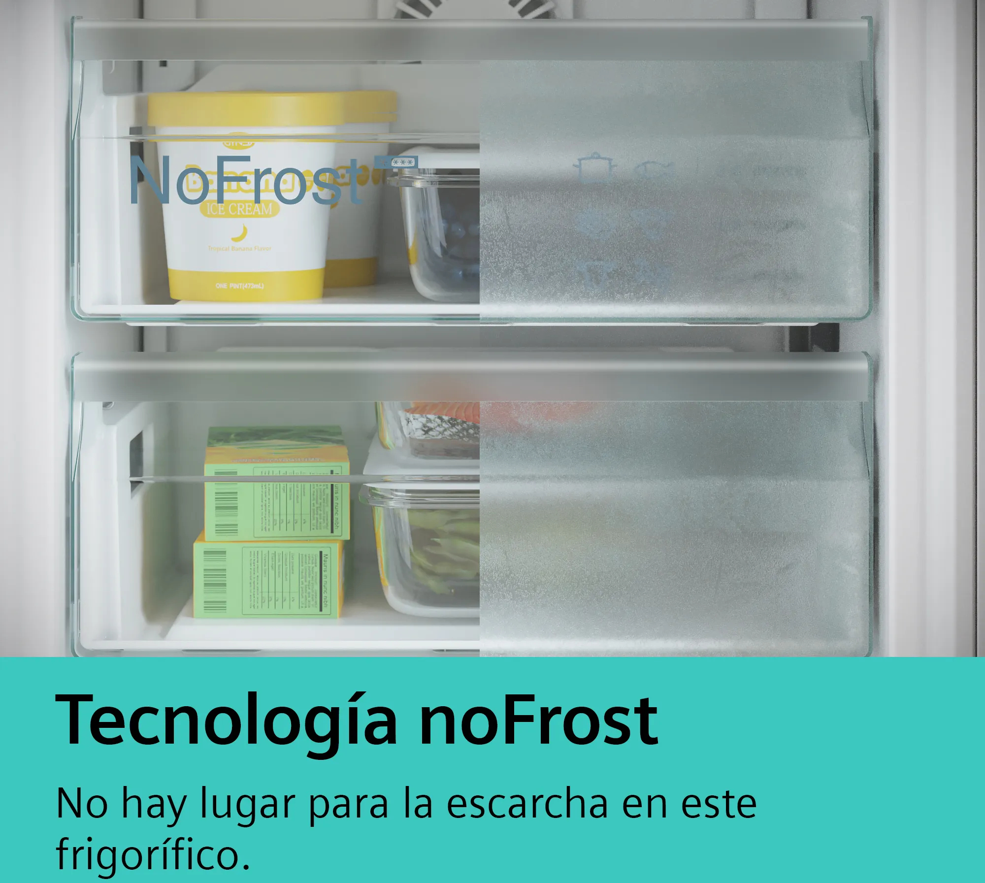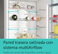 No hay lugar para la escarcha en este frigorífico.\nSe acabó el descongelar el frigorífico para conservar correctamente los alimentos y no malgastar energía. La tecnología noFrost extrae la humedad y mantiene seco el aire dentro del frigorífico. Esto evita que se forme escarcha en las paredes interiores o los alimentos, para que no tengas que descongelarlo nunca. Además, ahorra energía, porque un congelador sin escarcha consume menos.\n\nTodas las zonas del frigorífico enfrían igual.\nPara que los alimentos se conserven frescos, es necesario que todo el frigorífico enfríe igual. La pared posterior satinada con multiAirflow hace que el aire circule de manera uniforme para mantener una temperatura constante en todas las zonas. Los alimentos que acabas de meter en la nevera se enfrían rápidamente y la temperatura estable preserva su frescura.\n\nMás espacio y más frescura.\nLlena tu nevera con todas las frutas y verduras que quieras. Y para las carnes y pescados, tienes un compartimento con su propio suministro de aire frío, que mantiene los alimentos en perfectas condiciones durante más tiempo. Más espacio y conservación ideal, en un mismo sistema.\n\nPerfecta visibilidad del interior de tu frigorífico.\nLa iluminación LED permite una perfecta visibilidad del interior del frigorífic\n\nEnfría más rápidamente.\nPuedes utilizar la función ""super-refrigeración"" para reducir la temperatura del frigorífico hasta 2 ºC. Esta función permite un incremento extra de aire frío que ayuda a enfriar más rápidamente. Además, evita que la temperatura de los alimentos ya fríos aumente cuando se introducen nuevos productos a mayor temperatura.