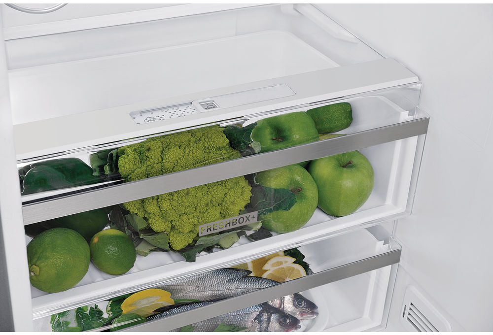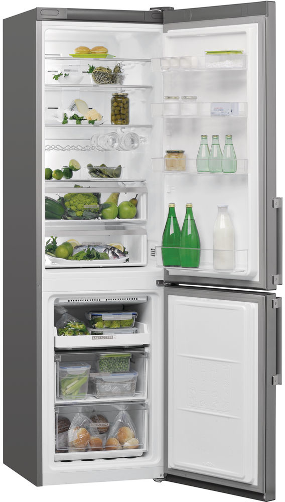 Frigorífico combinado de libre instalación Whirlpool: libre de escarcha, sin hielo - W7 921O OX H\nLas características de este Combi de libre instalación Whirlpool: color inox. Diseño óptico inox con protección anti-huellas. No Frost, tecnología sin escarcha, que previene eficazmente la formación de hielo en el congelador, reduciendo el nivel de humedad. Un electrodoméstico alto\npara acomodar las necesidades de tu familia. Estantes de cristal , que proporcionan solidez y elegancia. 6th Sense Control Tecnología que restaura rápidamente la temperatura y humedad ideales. La tecnología 6TH SENSE detecta constantemente las variaciones de temperatura y humedad debido a causas externas (es decir, la apertura de la puerta) y restaura rápidamente la temperatura y humedad ideales para una conservación óptima de los alimentos tanto en la nevera como en la en el congelador. Evitar quemaduras en los alimentos almacenados en el congelador.\n\nFresh Box+\nLas frutas y verduras se mantienen frescas hasta 15 días *. Un cajón con control deslizante de control de humedad integrado que le permite mantener sus frutas y verduras frescas hasta 15 días *. * Basado en la pérdida de peso y la calidad visual , considerando las frutas y verduras comunes. Procedimiento interno de prueba.\n\nTotal NoFrost\nNo vuelvas a descongelar. Ya no habrá más hielo en el frigorífico.\n\nEstante extraíble\nAcceda a sus alimentos fácilmente. Es extraíble hasta 12 cm, lo que permite un fácil acceso incluso a los alimentos almacenados en la parte posterior de los\nestantes.\n\nBandeja de uso fácil\nPara encontrar de inmediato cuáles son sus alimentos de uso más frecuente. Una bandeja especial que se desliza para ver mejor y acceder fácilmente a los alimentos de uso más frecuente almacenados en el congelador.\n\nAhorro energético\nRecuperación de la temperatura ultra-rápida. La innovadora tecnología Ahorro energético ofrece una recuperación de la temperatura muy rápida, garantizando un bajo consumo energético y un frescor prolongado.\n\nPantalla Inteligente\nUna pantalla con un nuevo diseño, grande y visible, para un control preciso de su dispositivo.