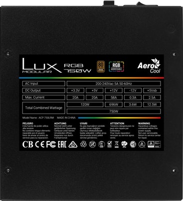 Aerocool LUX RGB 750M. Potencia total: 750 W, Voltaje de entrada AC: 200 - 240 V, Frecuencia de entrada AC: 50/60 Hz. Alimentador de energía para tarjeta madre: 20+4 pin ATX, Longitud del cable de alimentación de la placa base: 50 cm, Longitud del cable de alimentación SATA: 500,550 mm. Utilizar con: PC, Certificación 80 PLUS: 80 PLUS Bronze. Color del producto: Negro, Tipo de enfriamiento: Activo, Diámetro de ventilador: 12 cm. Ancho del paquete: 230 mm, Profundidad del paquete: 195 mm, Altura del paquete: 95 mm