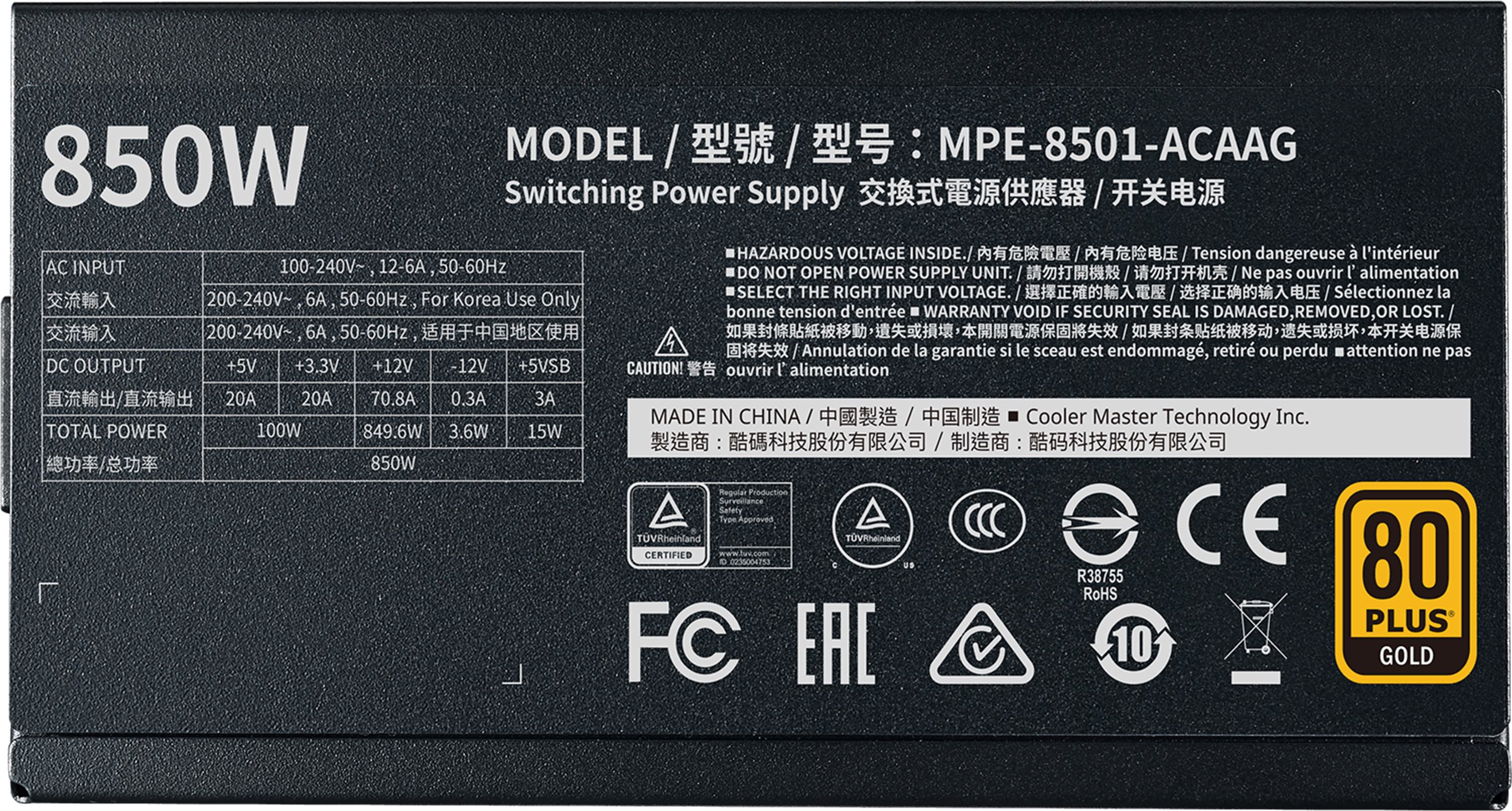 Cooler Master MWE Gold 850 - V2 Full Modular. Potencia total: 850 W, Voltaje de entrada AC: 90 -264 V, Frecuencia de entrada AC: 47 - 63 Hz. Alimentador de energía para tarjeta madre: 24-pin ATX, Longitud del cable de alimentación de la placa base: 61 cm, Longitud del cable de alimentación SATA: 500,620,740,860 mm. Utilizar con: PC/servidor, Factor de forma de fuente de alimentación (PSU): ATX, Certificación 80 PLUS: 80 PLUS Gold. Color del producto: Negro, Tipo de enfriamiento: Activo, Diámetro de ventilador: 12 cm. Ancho: 150 mm, Profundidad: 160 mm, Altura: 86 mm