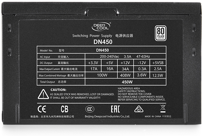 DeepCool DN450. Potencia total: 450 W, Voltaje de entrada AC: 200 - 240 V, Frecuencia de entrada AC: 47 - 63 Hz. Alimentador de energía para tarjeta madre: 20+4 pin ATX, Longitud del cable de alimentación de la placa base: 45 cm, Longitud del cable de alimentación SATA: 100,350 mm. Utilizar con: PC, Certificación 80 PLUS: 80 PLUS White, Tiempo medio entre fallos: 100000 h. Color del producto: Negro, Tipo de enfriamiento: Activo, Diámetro de ventilador: 12 cm. Cables incluidos: Corriente alterna, PCIe, Peripheral (Molex), SATA, Tipo de embalaje: Caja