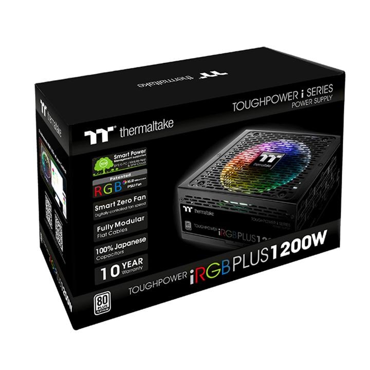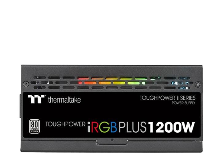Thermaltake Toughpower iRGB PLUS. Potencia total: 1200 W, Voltaje de entrada AC: 100 - 240 V, Máxima energía: 1440 W. Alimentador de energía para tarjeta madre: 24-pin ATX, Longitud del cable de alimentación de la placa base: 60 cm, Longitud del cable de alimentación periférico (Molex): 150,500 mm. Utilizar con: PC, Certificación 80 PLUS: 80 PLUS Platinum, Tiempo medio entre fallos: 120000 h. Color del producto: Negro, Diámetro de ventilador: 14 cm, Número de ventiladores: 1 Ventilador(es). Ancho: 150 mm, Profundidad: 180 mm, Altura: 86 mm