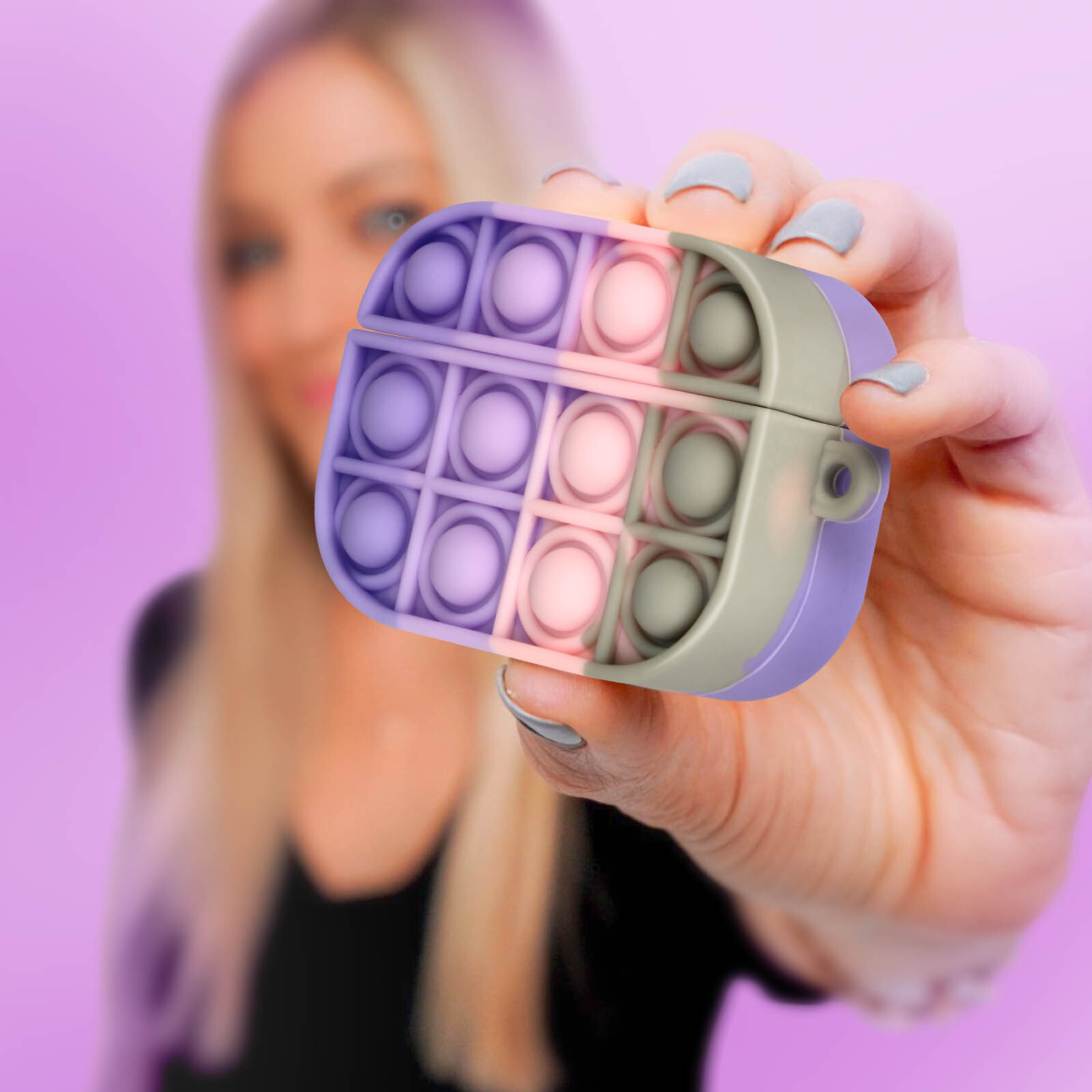 Carcasa Bubble Pop para el estuche de los Airpods Pro de Apple. Hecha de silicona. Protección contra burbujas. Pequeña cadena de metal. Diseño personalizado. Diseño de 2 piezas. Puerto de carga accesible. Funciona con un cargador inalámbrico. • Características y Puntos fuertes: Carcasa Bubble pop Fidget Toy, diseñado para el Carcasa Apple Airpods Pro. Protección de burbujas en colores vibrantes y relajantes.. Accesorio desestresante: presiona las burbujas para relajarte. Trending en redes sociales, ideal para tus contenidos de Tik Tok