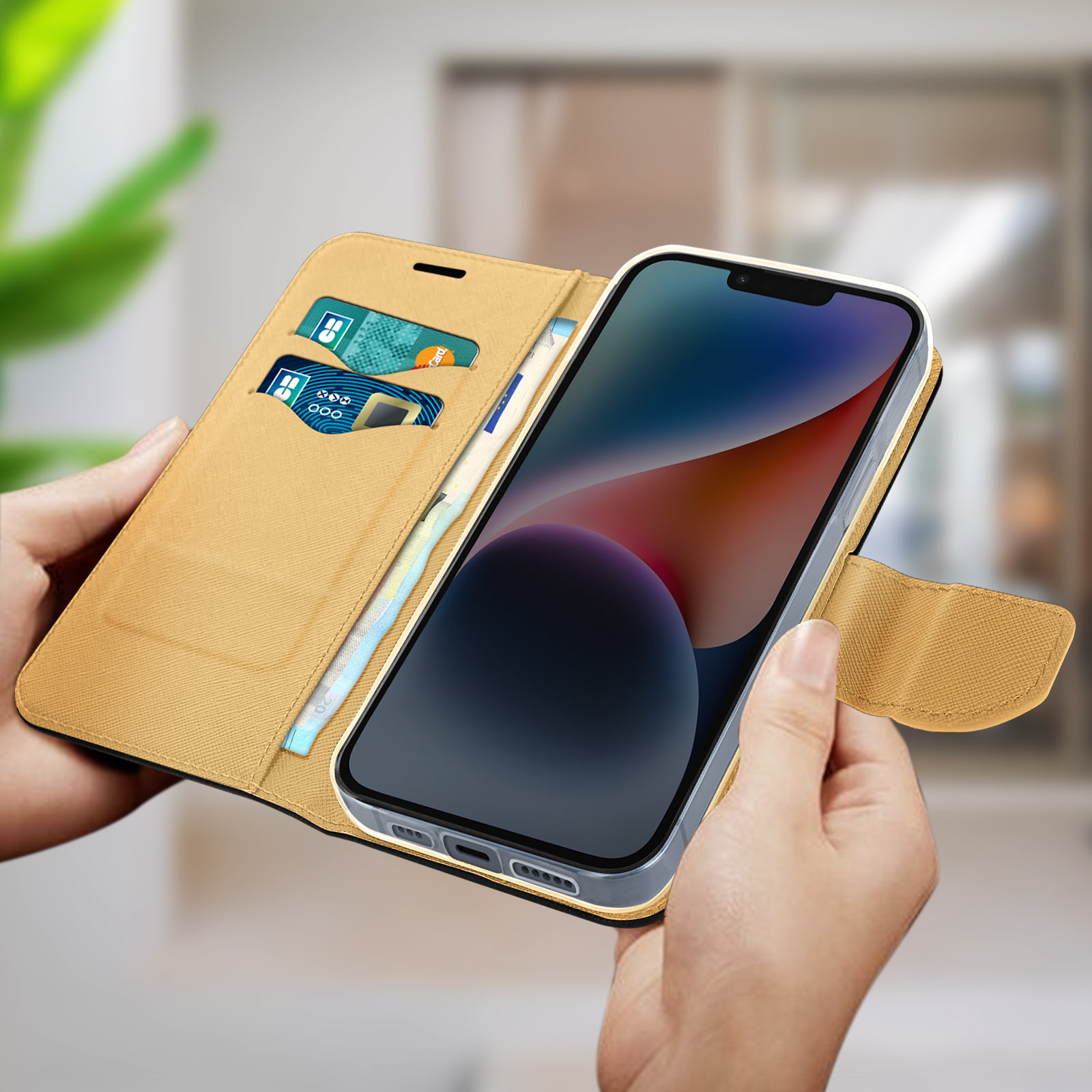Funda de polipiel en dos tonos para el iPhone 14 Plus. Protección total. Diseño único y atractivo. Función de soporte horizontal. Espacio de almacenamiento dentro de la cubierta. Pestaña magnética. Funciones accesibles, botones rediseñados. • Características y Puntos fuertes: Funda especialmente diseñada para tu Apple iPhone 14 Plus. Funda de polipiel bicolor con acabado cosido para un aspecto original y elegante. Protege eficazmente tu teléfono de las caídas y arañazos cotidianos. Solapa interior con función de tarjetero