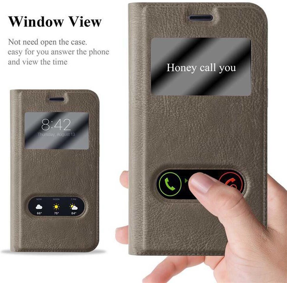 DISE?O: Elegante funda de cuero sintetico en estilo cierre magnetico invisible. La tapa se puede abrir/doblar hasta 360? y, por lo tanto, no estorba al hablar por telefono o al escribir. Gracias al cuero sintetico seleccionado y sus colores lujosos la funda es perfecta para una impresion seria. La carcasa integrada de TPU silicona se adhiere firmemente en la tapa y le da un ajuste perfecto a su telefono inteligente. FUNCIoN: La funda tiene dos ventanas de inspecion y una puerta frontal magnetico. Todas las opciones del telefono se puede utilizar sin inconveniente; las teclas y los botones son de facil alcance y los conectores quedan libremente accesibles. El telefono se inserta en la carcasa de silicona pegada a la funda y se puede quitar facilmente, cuando sea necesario. Gracias a las ventanas se puede acceptar llamadas o echar un vistazo a la pantalla de su telefono sin tener que abrir la funda libro. CALIDAD: Se ha elegido a consideracion a los mejores criterios para confeccionarla de manera robusta, resistente y duradera. La funda para el movil esta completamente cosida y, por dentro, forrada con una suave piel sintetica. Durante el proceso de elaboracion se ha prestado atencion a todo: costuras limpias, cavidades limpias, esquinas y bordes limpios. Para la fabricacion se utilizaron selectos y robustos cuero de imitacion y plastico. PROTECCIoN: La funda ofrece una muy buena proteccion integral. Tanto la pantalla como la parte trasera estan bien protegidos en esta funda. La carcasa silicona ofrece una proteccion adicional para las esquinas y los bordes del telefono movil. Gracias a la cerradura magnetica, el telefono inteligente queda tambien protegido, por ejemplo, incluso dentro de un bolso de mano. OTROS: A pesar de la buena proteccion, recomendamos una pelicula protectora para la pantalla. La proporciona proteccion adicional contra ara?azos en la pantalla y esta disponible en nuestra tienda. ?El telefono inteligente, el dinero y las tarjetas que se muestran NO estan incluidos!